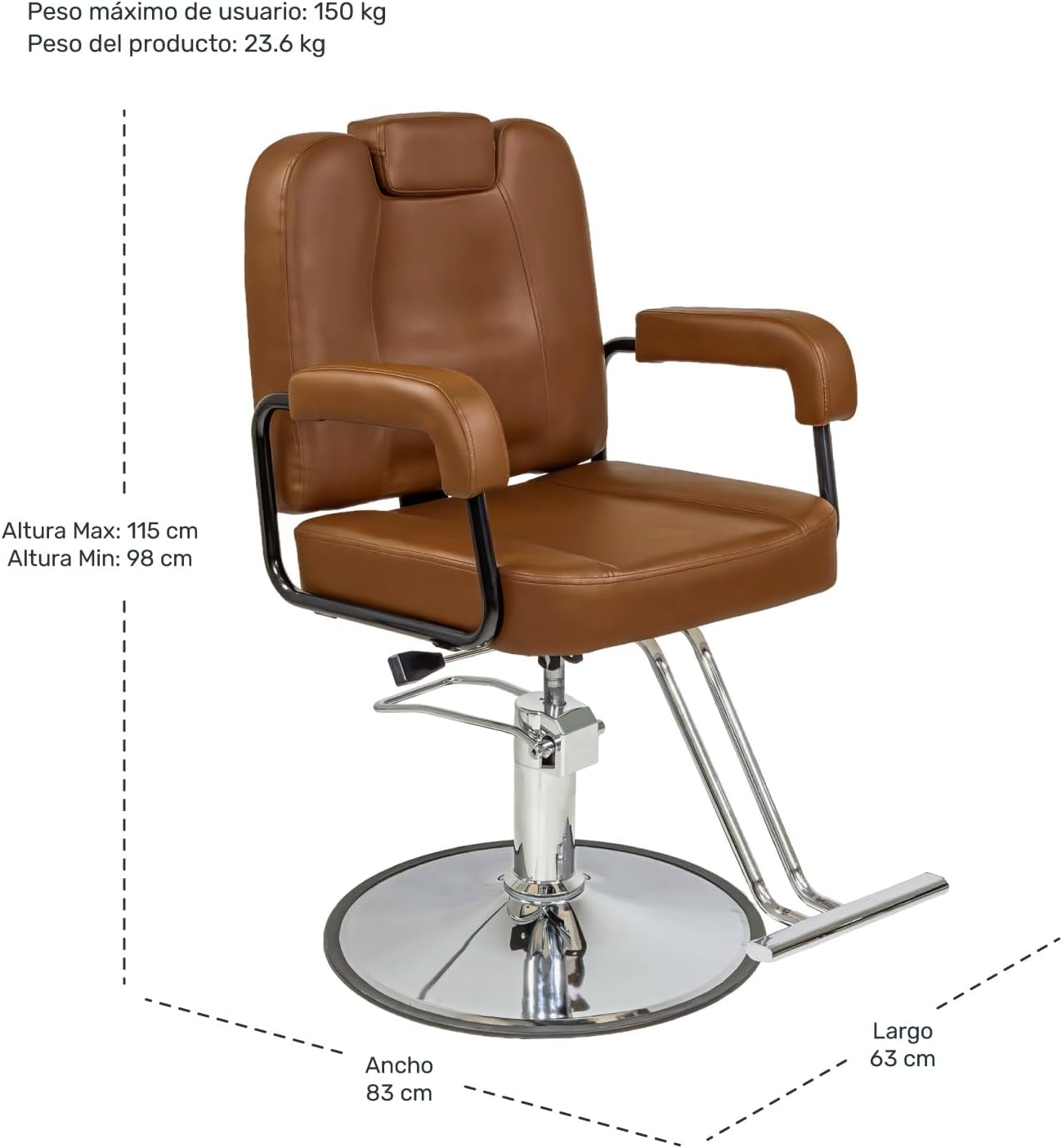 [Diseñada para salones de belleza, barberías y espacios de estética] [Capacidad de giro de 360° e inclinación de 45°] [Ajuste de altura que va desde de 98 cm hasta 115 cm] [Capacidad de carga de 150 kg] [Superficie de vinipiel resistente al agua y de mantenimiento sencillo] DATOS TÉCNICOS Materiales: - Acero - Vinipiel (cuero sintético) - Espuma de poliuretano Medidas del reposapiés: 29.5 x 4 x 2 cm Acabado: - Tela mate - Acero brillante Medidas de asiento: 52 x 47 cm - Grosor: 10 cm Altura del piso al asiento: - Mínima: 52 cm - Máxima: 65 cm Peso máximo del usuario: 150 kg Medidas de respaldo: 50 x 50 cm - Grosor: 10 cm Diámetro de base: 58 cm Características especiales: - Silla con ajuste de altura - Inclinación de respaldo - Reposabrazos acolchados Altura de la silla: - Mínima: 98 cm - Máxima: 115 cm Cantidad de piezas: 7 piezas Longitud de reposapiés con respecto al asiento: 43 cm Medidas de pistón: - Longitud: 33 cm - Diámetro: 8 cm Tornillería: - Tornillos para respaldo - 4 tornillos Allen cabeza plana M8x25mm - Tornillos para reposabrazos - 8 tornillos hexagonales con arandela M8x20mm - Tornillos para reposapies - 2 tornillos hexagonales con arandela M8x12mm - Tornillos para pistón - 6 tornillos Allen cilindricos M6x12mm - 6 arandelas de resorte M6xØ10mm - 1 Llave Allen 5mm - 1 Llave Allen DE 4mm Grados de giro: 360° Grados de reclinación: 45° Reposacabezas: 18 x 10 x 9 cm - Altura ajustable hasta 21 cm Tubular de reposabrazos: - Grosor: ø 2.2 cm - Pistón para inclinación: - Modelo: JQK10/26 60/165 550N - Diámetro: 2.6 cm - Longitud: 20 cm - Recorrido: 2.8 cm INCLUYE - 2 reposabrazos - Asiento - Respaldo - Base - Pistón - Reposapies - Palanca para ajuste de altura - Tornillería y herramientas MEDIDAS DEL PRODUCTO Largo: 63 cm Ancho: 83 cm Alto: 115 cm PESO DEL PRODUCTO 23.6 kg MEDIDAS DEL EMPAQUE Largo: 64 cm Ancho: 59 cm Alto: 40 cm PESO DEL PRODUCTO EMPACADO 26.3 kg