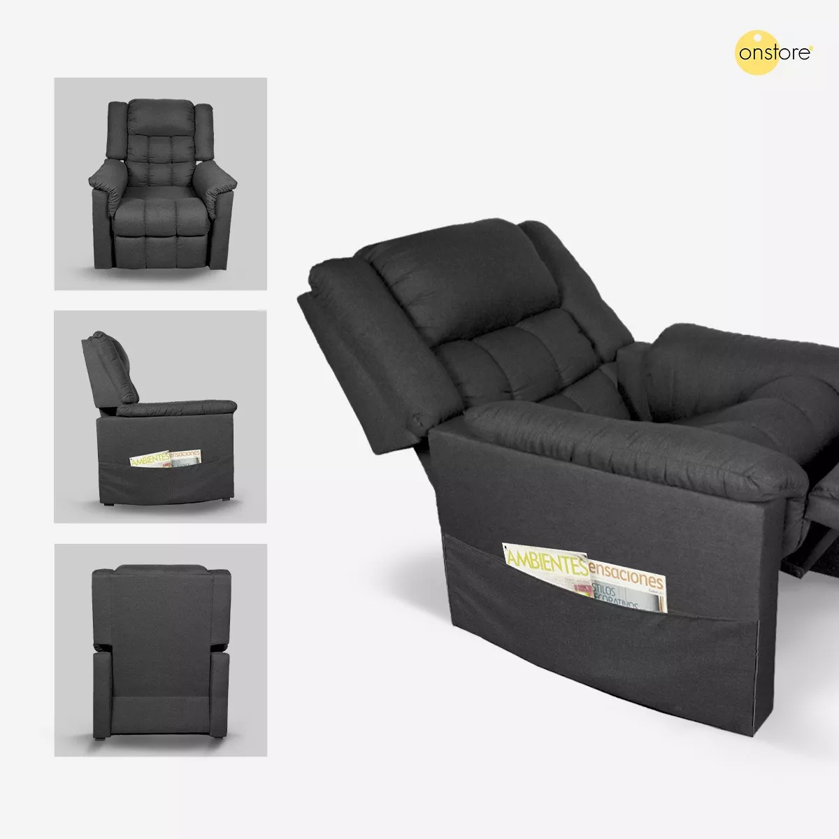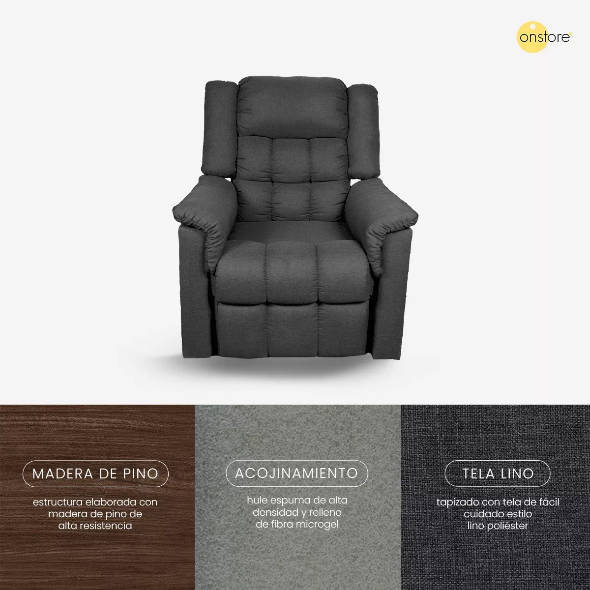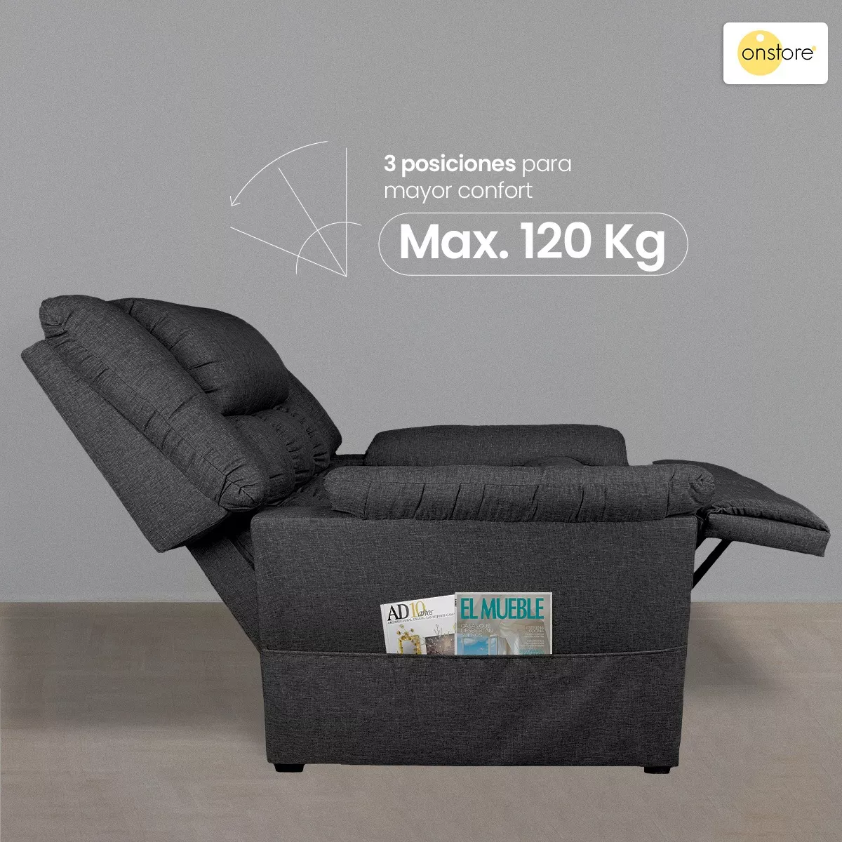 Sillón Reclinable Reposet Moderno Cómodo Resistente Tapizado Lino. Posee tres posiciones para máxima comodidad, soporte lumbar y bolsa lateral. Funcionamiento manual, se ajusta con el peso de la persona sentada. Apoya brazos acojinados para mayor confort etc. Materiales de alta calidad y durabilidad.