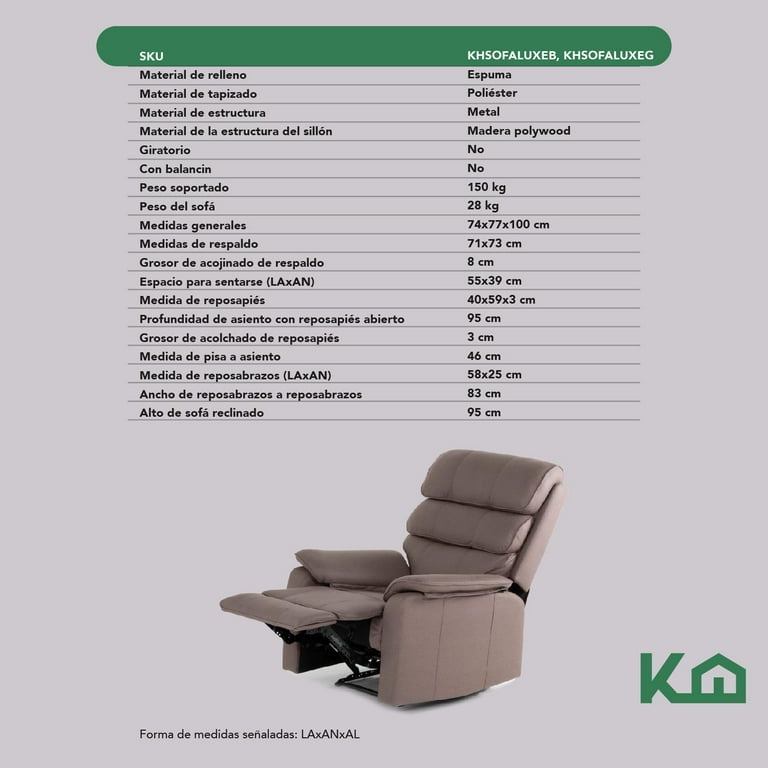 • Incluye 1 sofá reclinable, 1 manual, el producto llega en dos cajas.