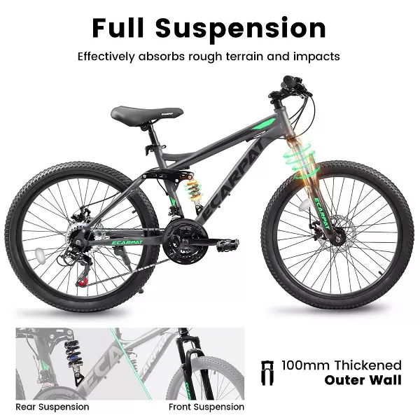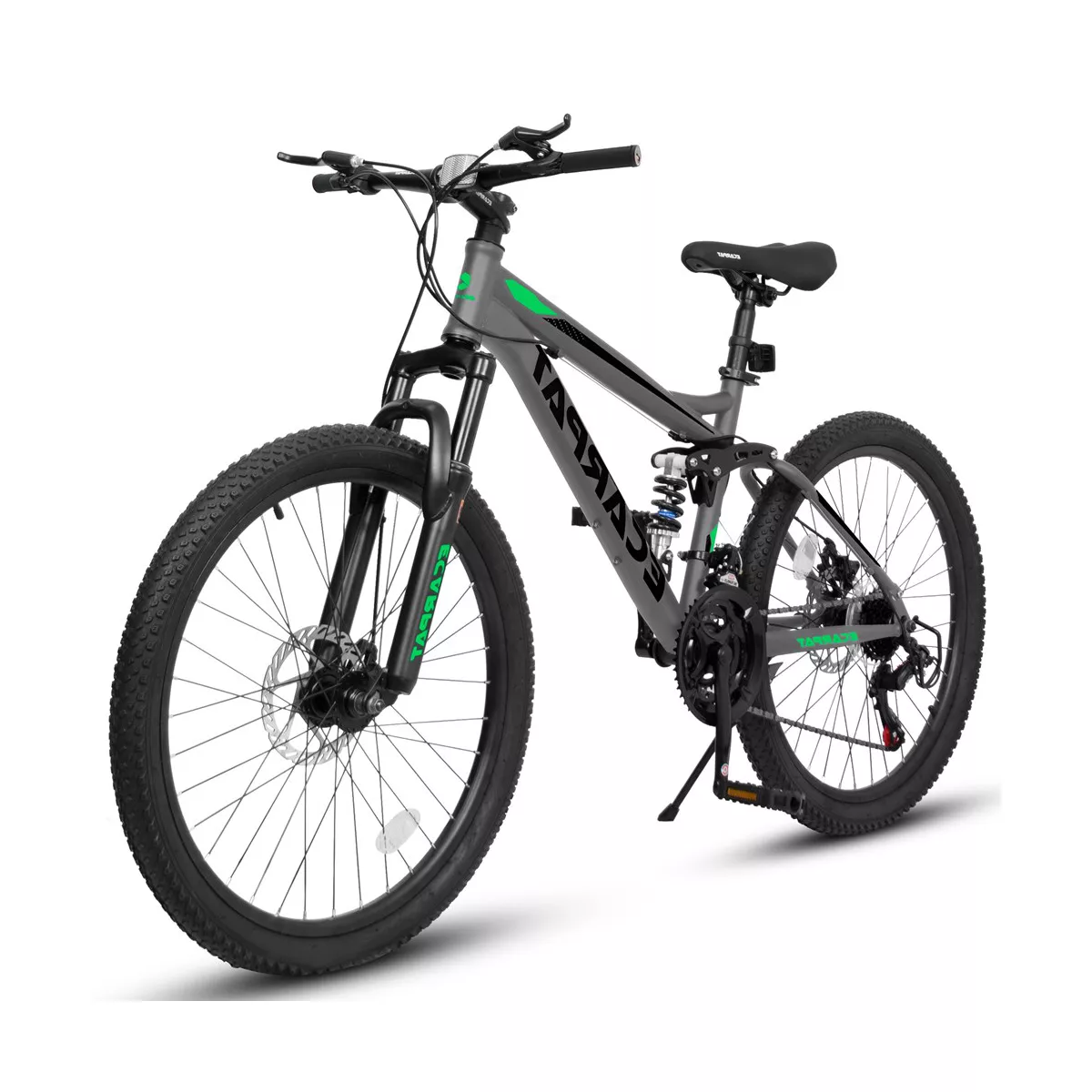 A2660 Mountain Bike 26Inch Wheels, 21Speed Full Suspension Trail, Carbon Steel Frame Disc Brakes Thumb Shifter Front Fork Rear Shock Absorber Bicycles