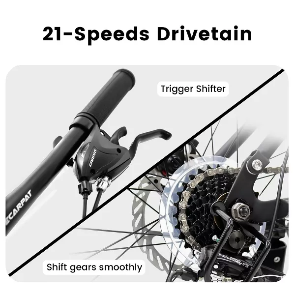 • 【21-Speed with Disc Brakes】Thumb shifter help to switch gears with smoothness. Simple operation allows for quick selection of gears for various terrains. Mechanical dual disc brake system, simple structure and convenient for maintenance.