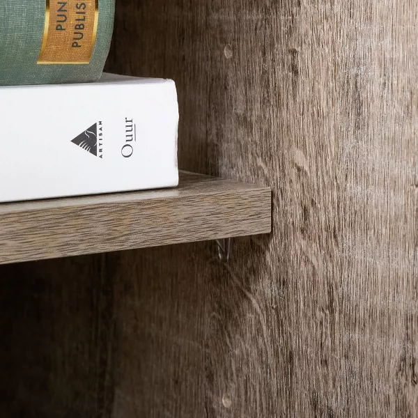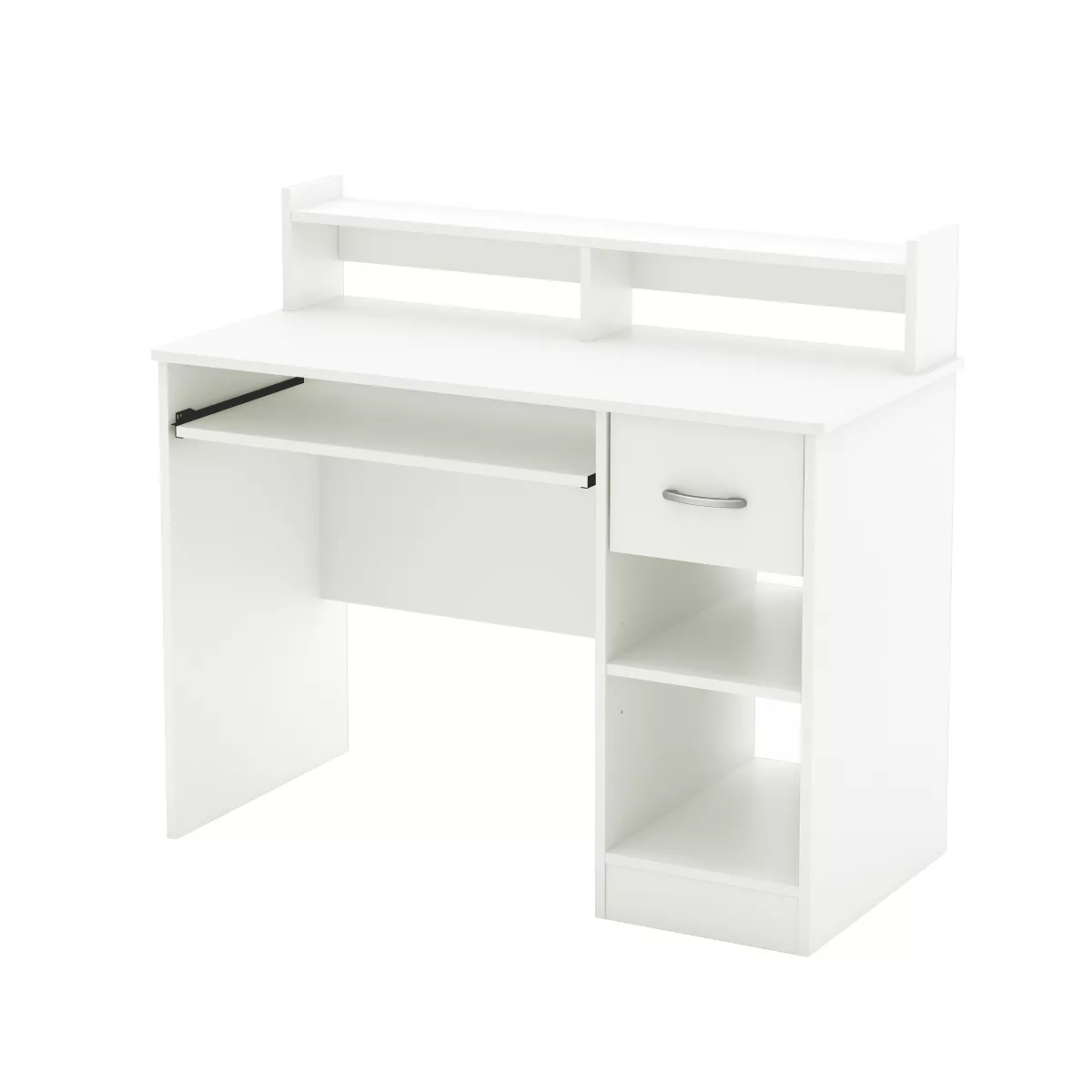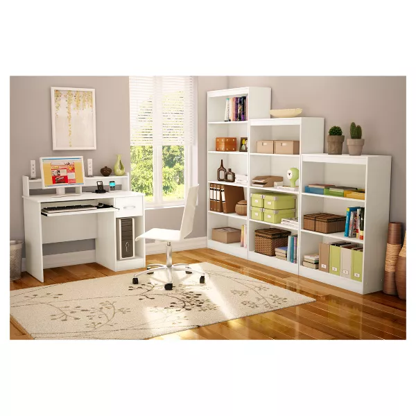 This Axess Desk is the perfect answer to organizing clutter. It features a drawer and slide-out keyboard tray, plus a lower open area divided by an deep adjustable shelf. Above the desk, there’s a low hutch with a shelf. And it has a hole in the back so you can organize wires from electronics.
