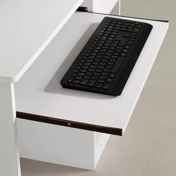 PERFECT FOR SMALLER SPACES. The compact design of the Axess desk includes all the space you need for a well-organized workspace, thanks to its open and closed storage spaces and keyboard tray. The work surface is great for laying out homework or a laptop and other items.