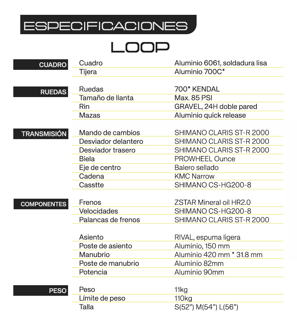 Nombre: BICICLETA GRAVEL DE RUTA LOOP R700*C, 16V, SHIMANO CLARIS