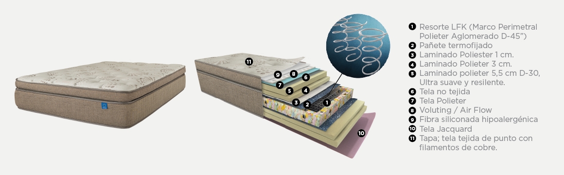 El modelo Terra Cobre + es una obra maestra de la ingeniería de descanso. Su estructura de resortes LFK brinda una firmeza y soporte excepcionales a tu columna vertebral. Pero lo que realmente distingue a este colchón es su tela con el doble de cobre. Las fibras con iones de cobre incorporadas en este colchón te ofrecen una capa de protección natural, invisible pero efectiva.