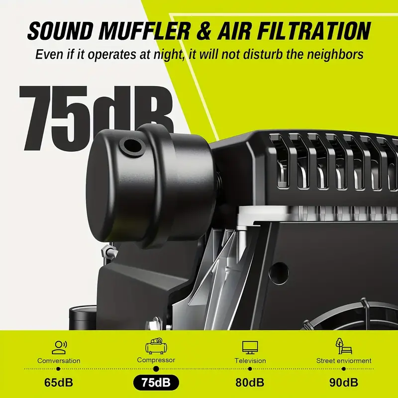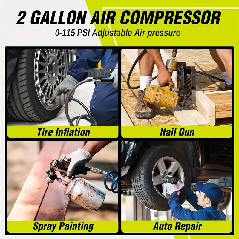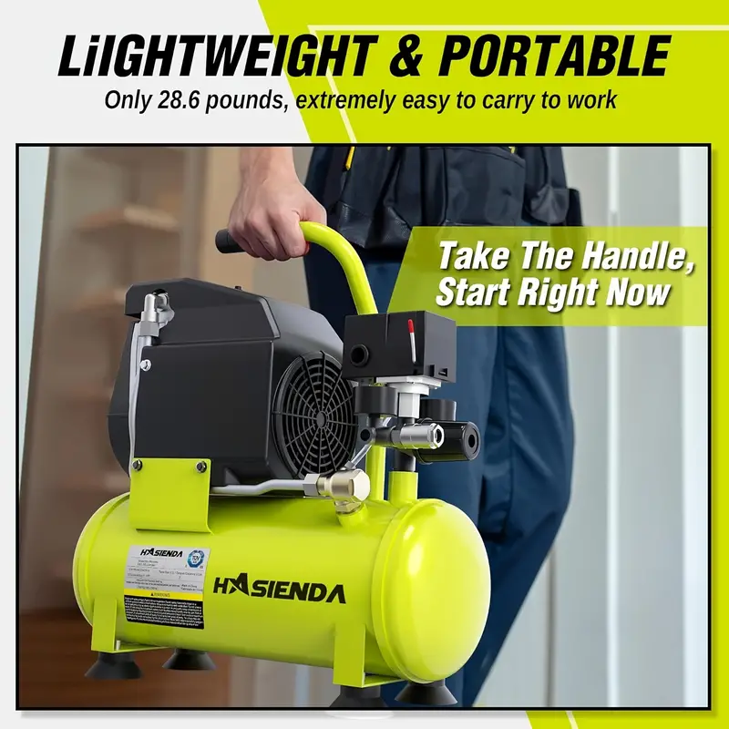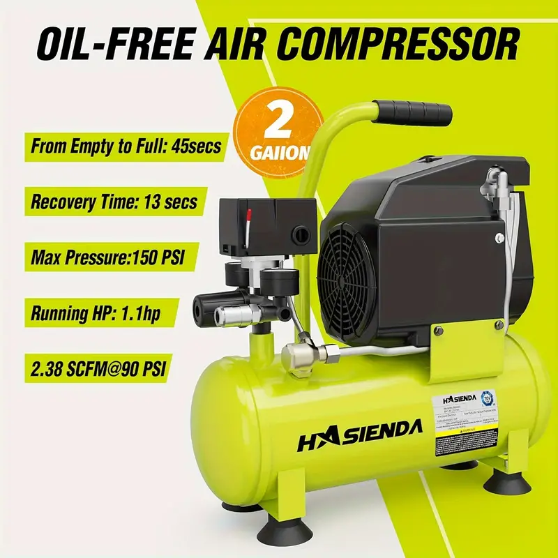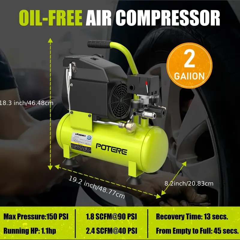 Compresor de aire de 2 galones, compresor de aire portátil de 2.3 SCFM a 90 PSI, compresor de aire pequeño sin aceite de 1.1 HP, presión máxima de 150 PSI, compresor de aire silencioso de 75 DB para taller, garaje, automóvil, herramientas neumáticas