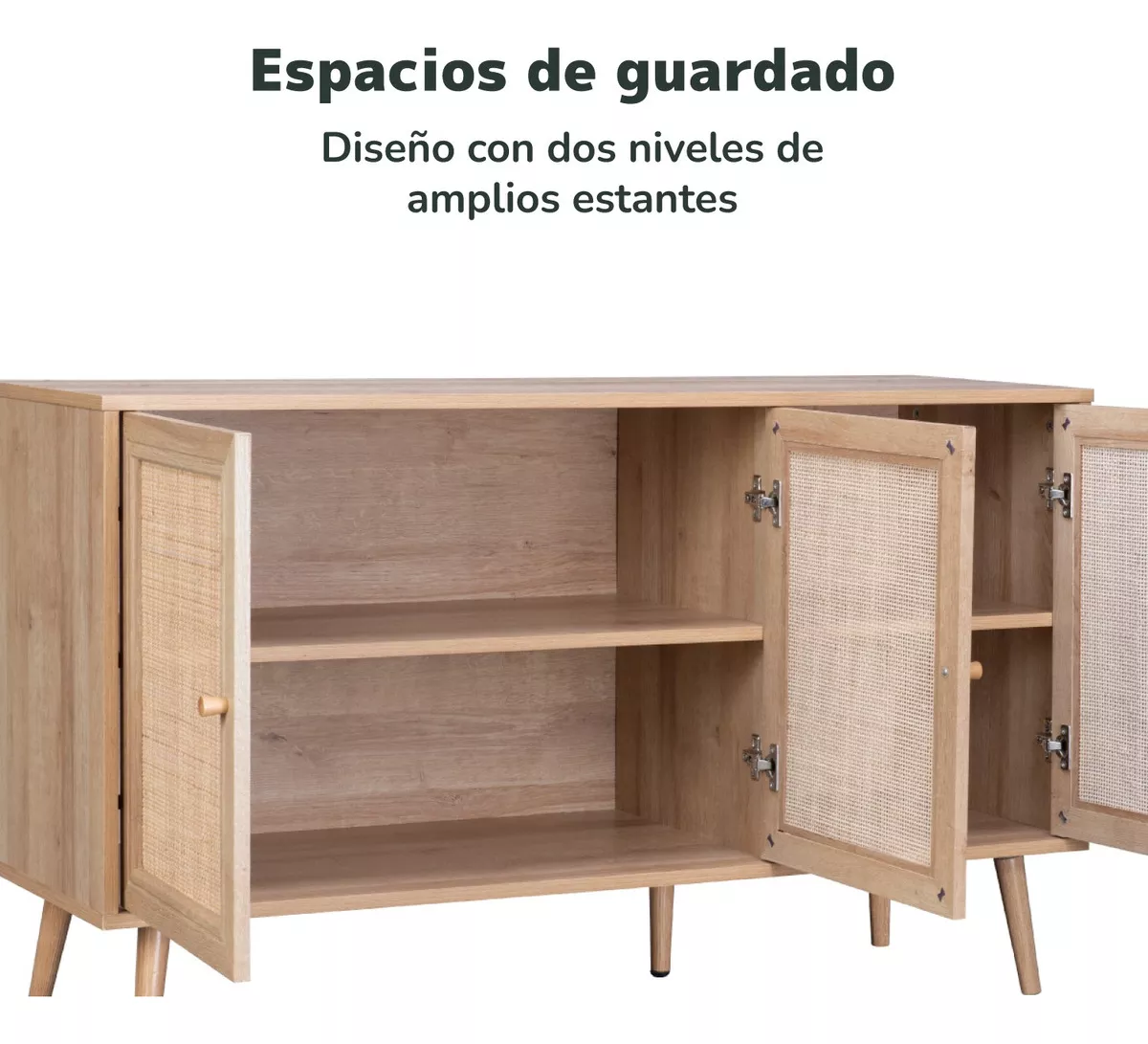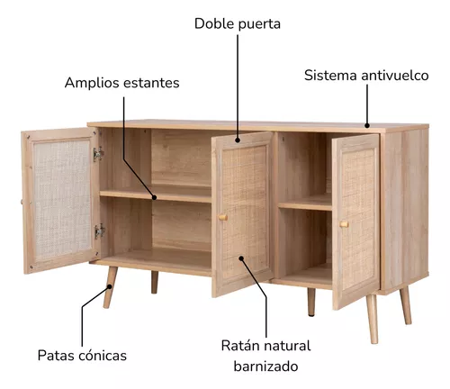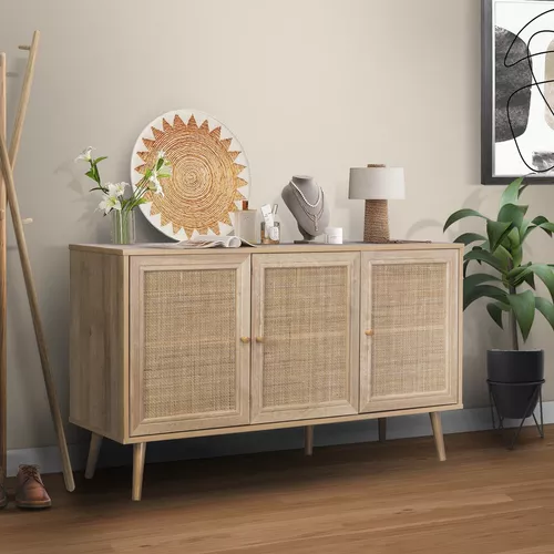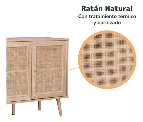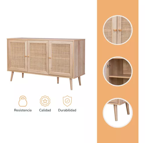Disfruta de esta credenza bufetera y optimiza al máximo el orden de tus espacios. Este versátil aparador multiusos cuenta con un gran espacio de almacenamiento y es adecuado para diversos ambientes como salas, comedores, cocinas y más. Su moderno diseño en ratán con colores claros, es ideal para obtener un estilo decorativo cálido y artesanal.