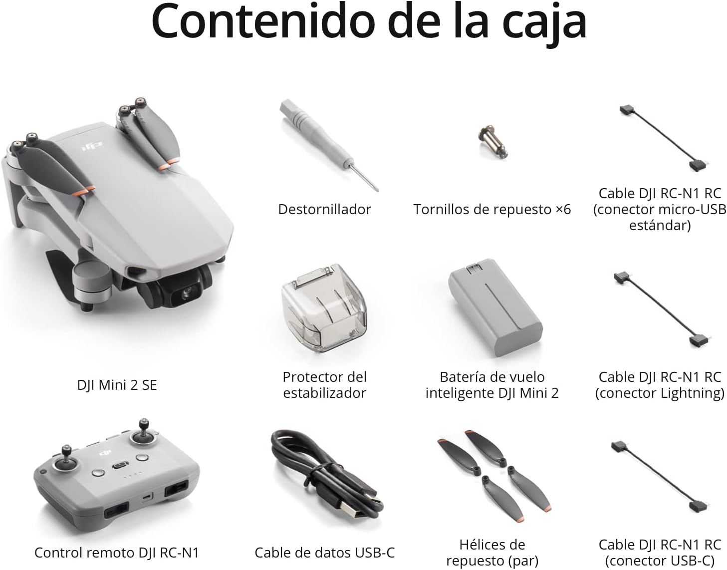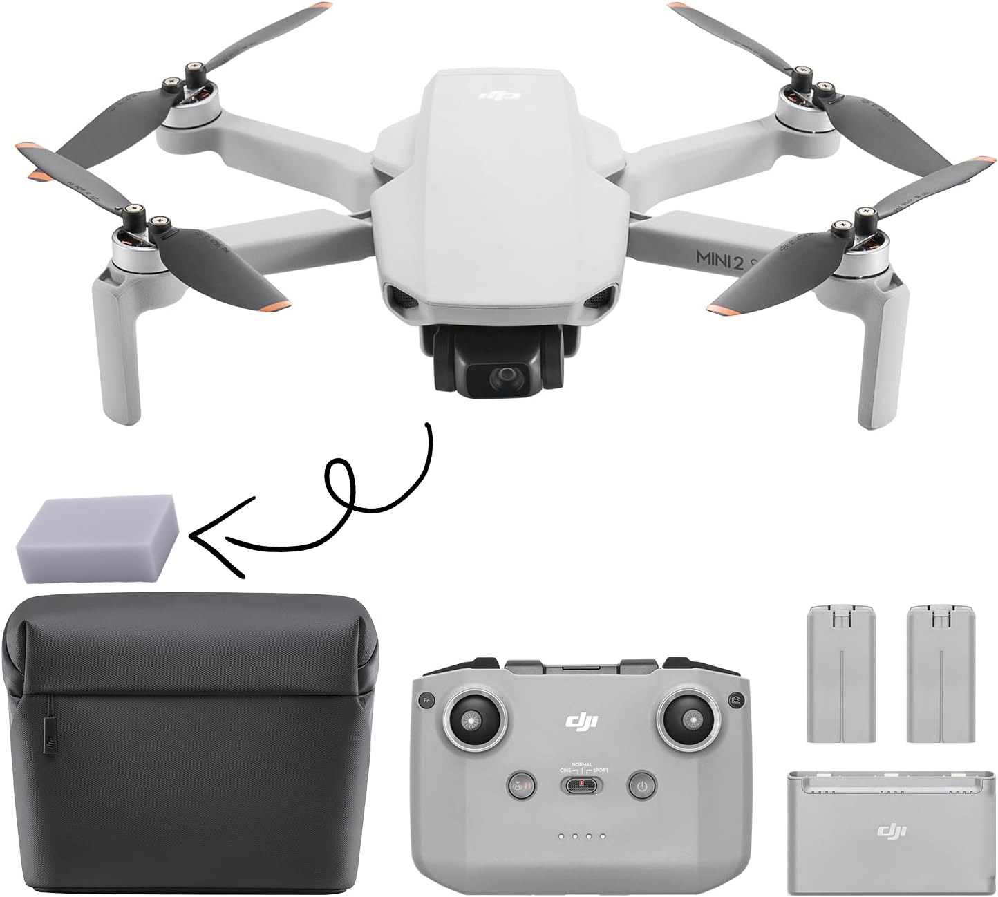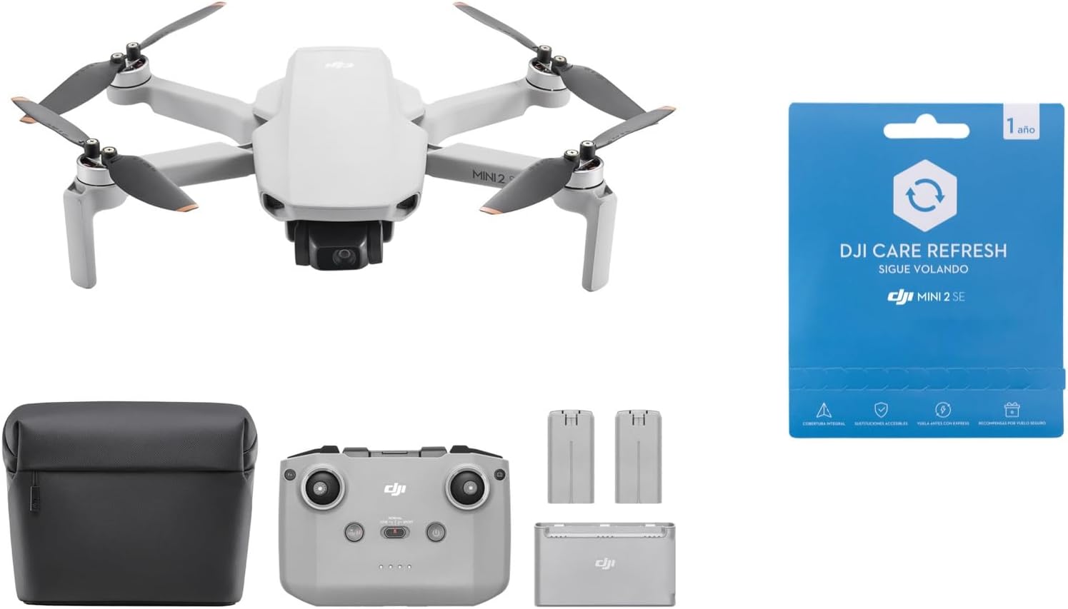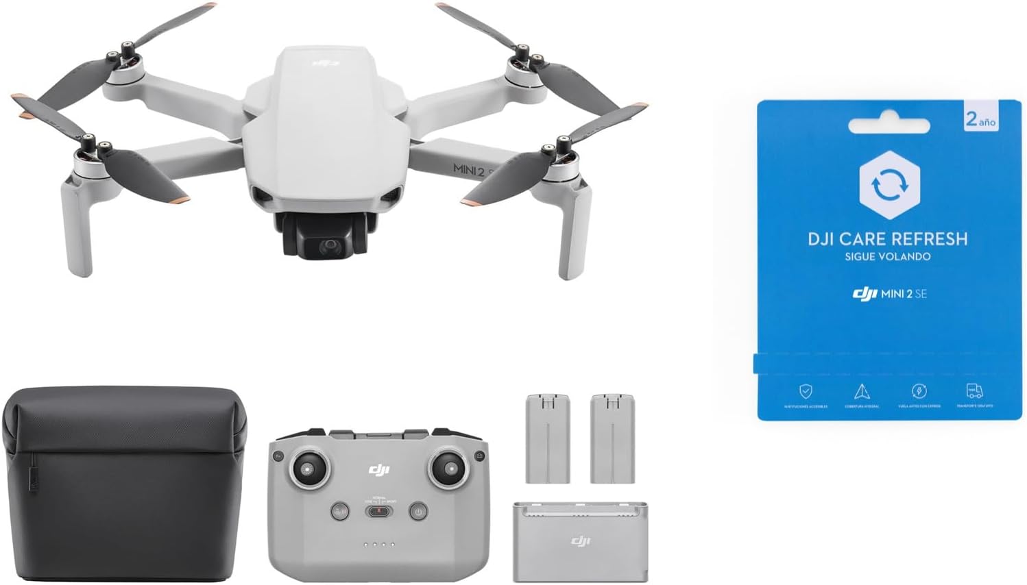 • Pack DJI Mini 2 SE Vuela Más - Con todo lo incluido en la versión estándar y dos baterías de vuelo inteligentes adicionales, una bolsa bandolera y más, para volar más tiempo y con más seguridad.