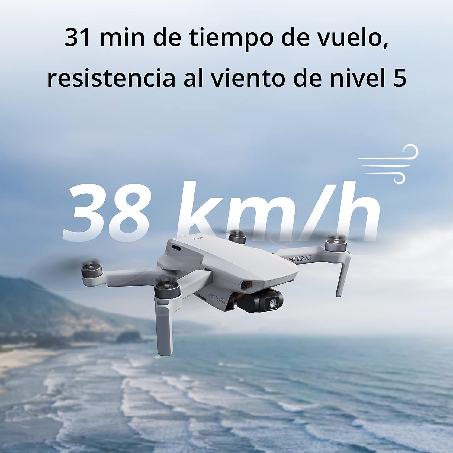 • Resistencia al viento de 38 km/h (nivel 5) - DJI Mini 2 SE vuela con estabilidad y fiabilidad incluso con vientos hasta 38 km/h (nivel 5) para que puedas volar y grabar con fiabilidad en más lugares.