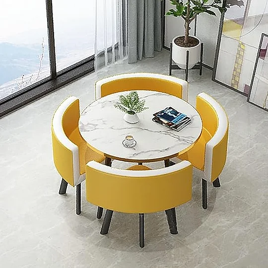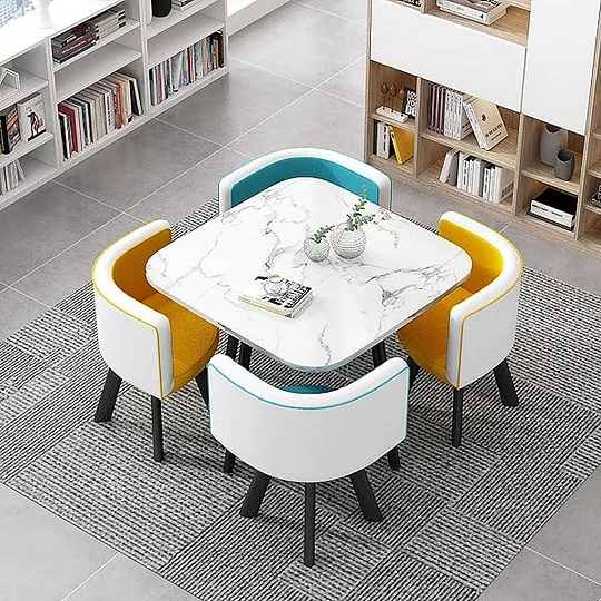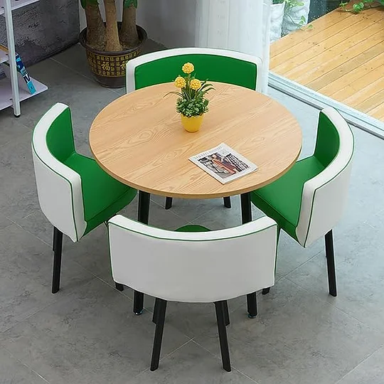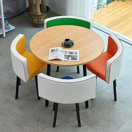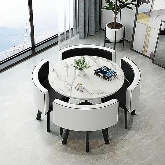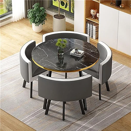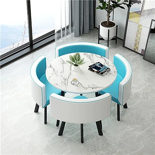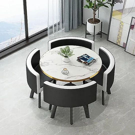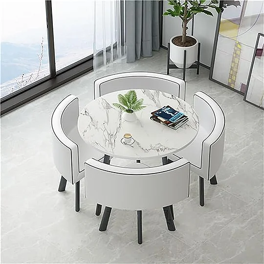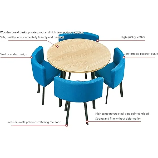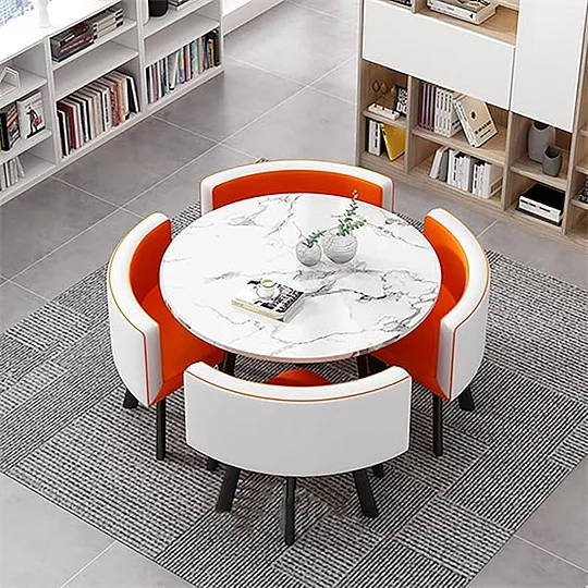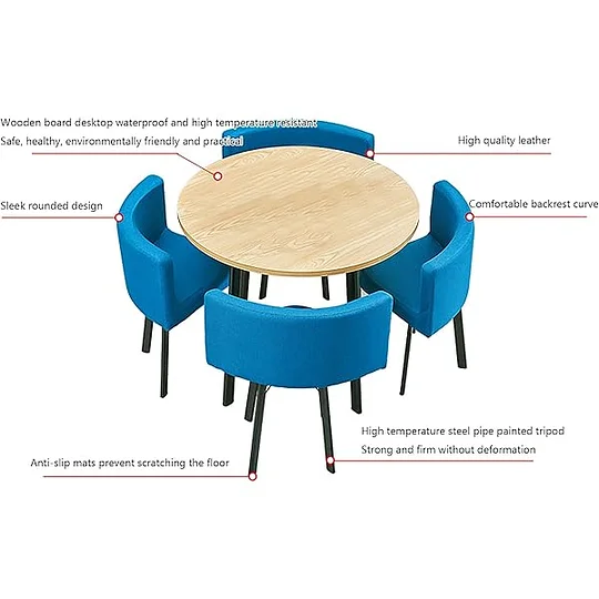 Aplicación versátil: la mesa redonda de mármol artificial maximiza el uso del espacio, aportando personalidad y encanto a cualquier habitación con su apariencia limpia y brillante. Adecuado for una variedad de entornos, como comedores, cocinas, salas de estar y oficinas, mejora la experiencia gastronómica, permitiendo a familiares y amigos disfrutar de hermosos momentos y apreciar la belleza de la vida juntos. Diseño que ahorra espacio: el sencillo escritorio de recepción y el juego de sillas no ocupan mucho espacio, lo que lo hace ideal for salas de reuniones pequeñas o áreas de recepción de invitados. Cuando no están en uso, los taburetes se pueden guardar debajo de la mesa, liberando espacio en la habitación y manteniendo la limpieza. Diseño ergonómico: la superficie del asiento está hecha de material PU de alta calidad, con respaldos y cojines envueltos en una esponja de alta densidad for un rebote excelente y duradero, adecuado for sentarse durante mucho tiempo. w99 El respaldo ligeramente inclinado se adapta al cuerpo humano, lo que permite una mejor relajación de la espalda. Materiales de alta calidad: la superficie de la mesa está fabricada con tableros ecológicos de grado E1, que ofrecen una superficie lisa y dura, inodora y fácil de limpiar. Su material robusto y práctico, junto con las esquinas redondeadas, minimiza las lesiones por colisión, garantizando la seguridad familiar en todo momento. Estructura de marco resistente: Cuenta con un marco de metal for mayor durabilidad, con un alto coeficiente de seguridad debido a las esquinas redondeadas de la mesa diseñadas for evitar colisiones. Las patas de la mesa están hechas de hierro espesado con pintura de alta temperatura y acabado arenado, lo que garantiza una longevidad sin envejecer. Las patas de las sillas vienen con almohadillas antideslizantes for evitar daños al suelo y ruidos.