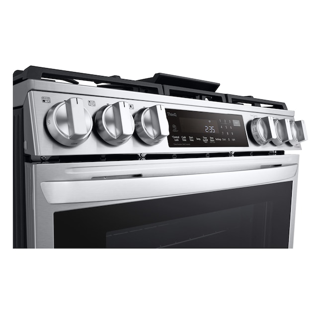 LG InstaView 30 pulgadas, 5 quemadores, 6.3 pies cúbicos, horno de convección para freír con aire autolimpiante, estufa de gas natural inteligente deslizable (acero inoxidable a prueba de impresión)