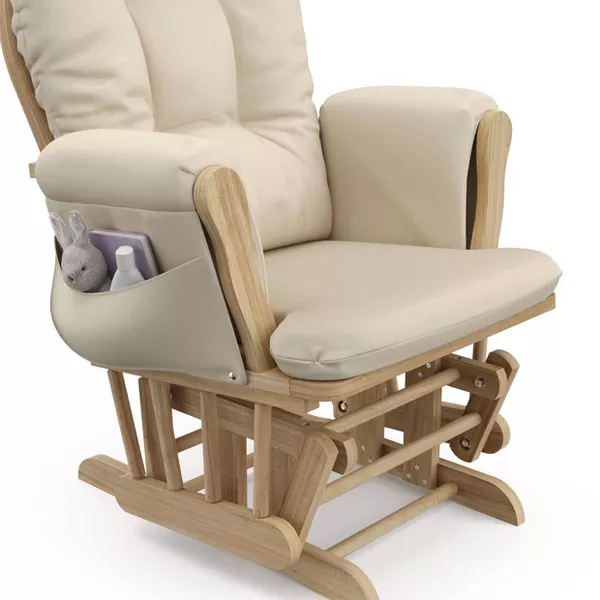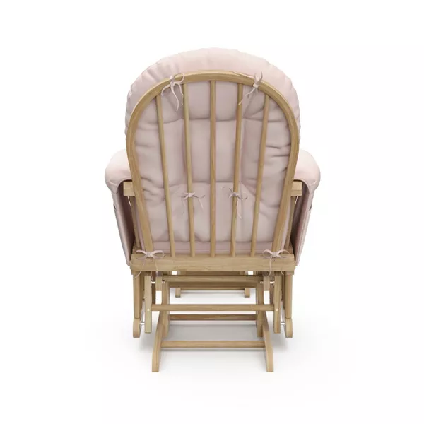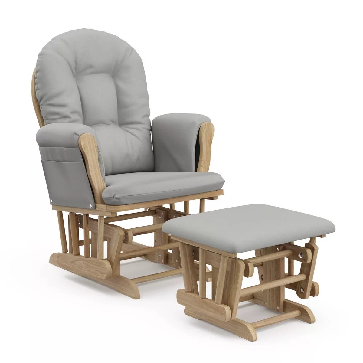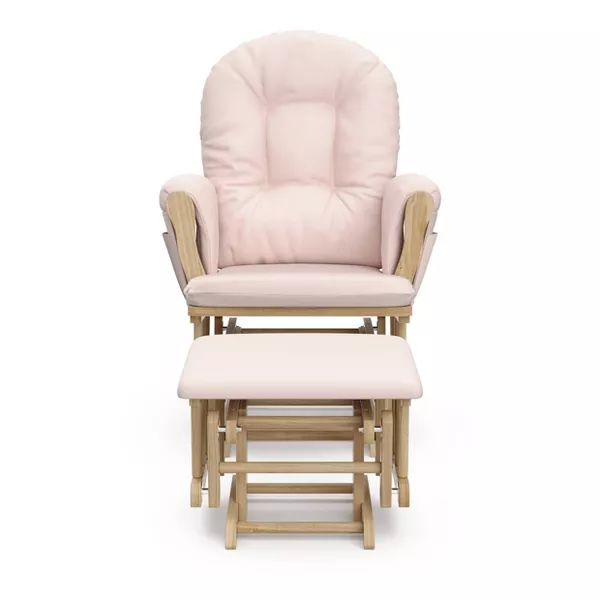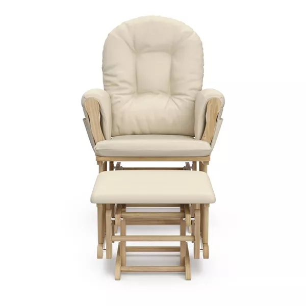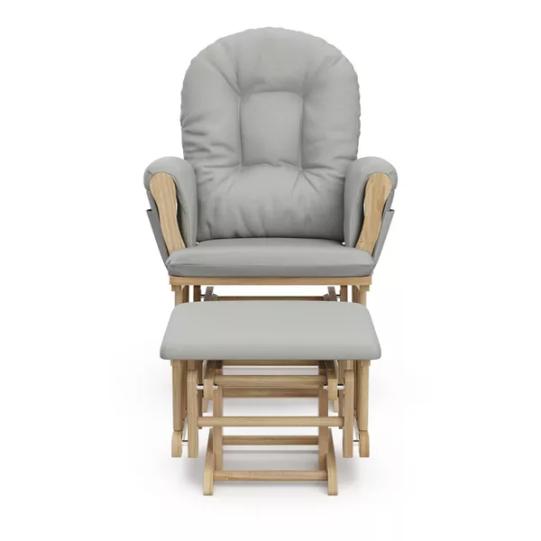 The Storkcraft Hoop Glider and Ottoman offers you generous seating room, comfortable padded arm cushions with storage pockets, and enclosed ball bearings for a smooth gliding motion to gently rock you and your little one. Each padded arm cushion includes a convenient storage pocket to hold any reading materials or essentials you need to keep within arm’s reach. The cushions are made of an easy to clean material. Designed to match any nursery, this glider is available in multiple cushion and base colors, so it will match your style and blend seamlessly with the rest of your nursery furniture. Maximum recommended weight (250 pounds); Depth (30.31 inches); Height (39.96 inches); Width (29.92 inches); Seat width (17.32 inches); Seat depth (18.7 inches); Floor to Seat top (17.32 inches); Ottoman length (15.35 inches); Ottoman height (14.37 inches); Ottoman width (19.69 inches). This product requires assembly. Base of glider made of solid hardwood material.