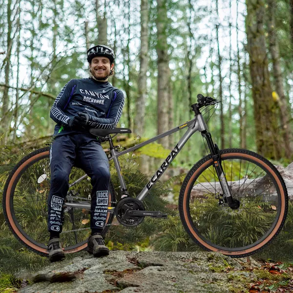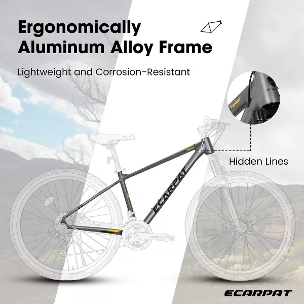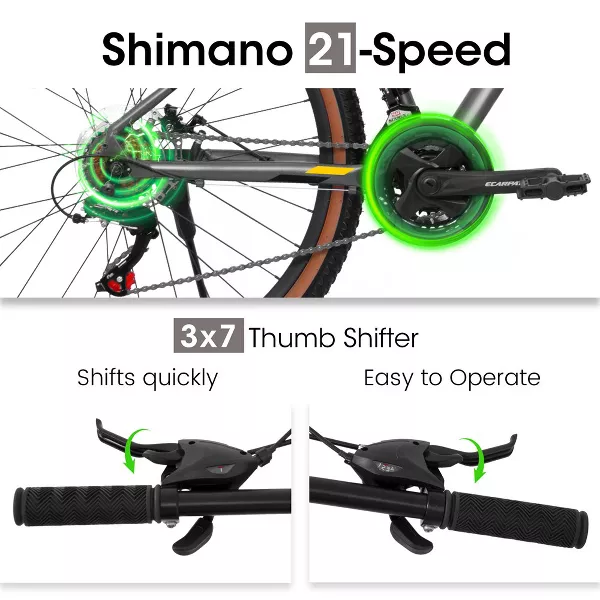 【Durable Aluminium Frame】27x16 inch sturdy and durable aluminium frame, provide safe and stable cycling experience. Ergonomically design, suitable for mens womens height 4'2"-4'9", max weight is up to 250lbs. 【21-Speed with Disc Brakes】Thumb shifter help to switch gears with smoothness. Simple operation allows for quick selection of gears for various terrains. Mechanical dual disc brake system, simple structure and convenient for maintenance. 【Front Fork Shock Absorbing Design】Feature 100mm front suspension fork. The thickened fork help resistant and absorb shocks. The parallel bars can adapt to pressure road conditions. Greatly improve the comfort during riding and allows you to enjoy riding. 【27*2.125" All-Terrain Tires】Made of high quality rubber, all-terrain tires with strong puncture ressistance soften the bumps and stick to the Dirt, Trail, Gravel, Paved Path for a smooth, stable ride: strong grip, have a super excellent anti-skid function and is not easy to slip. 【85% Pre-Assembled】The bike comes 85% pre-assembled. You need to assemble the handlebar, saddle, front wheel and pedals. After a short adjustment of the brakes and gears you can start riding immediately. Please note that if you have any questions, you could contact our customer service first.