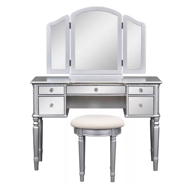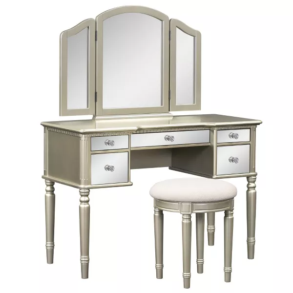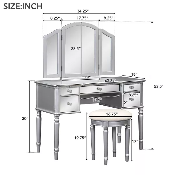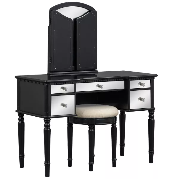 The adjustable tri-fold mirror ensures a perfect view from every angle, while five drawers including three velvet-lined compartments for jewelry offer ample storage.