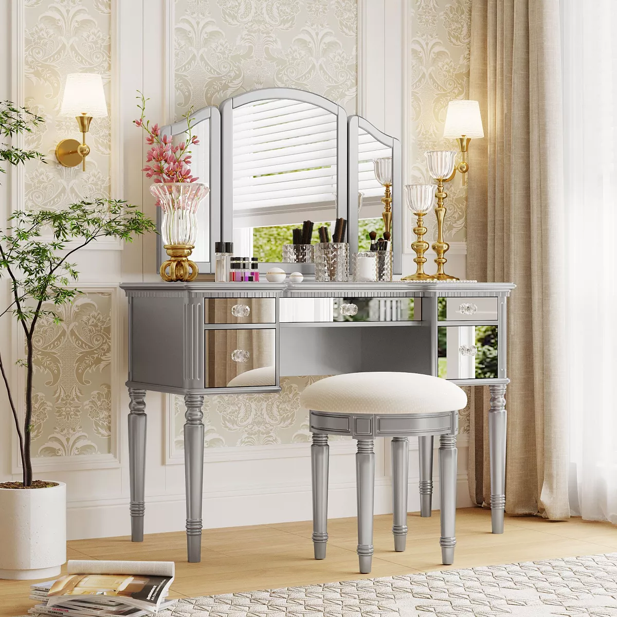 Elevate your bedroom with this elegant dressing table that blends modern and French styles.