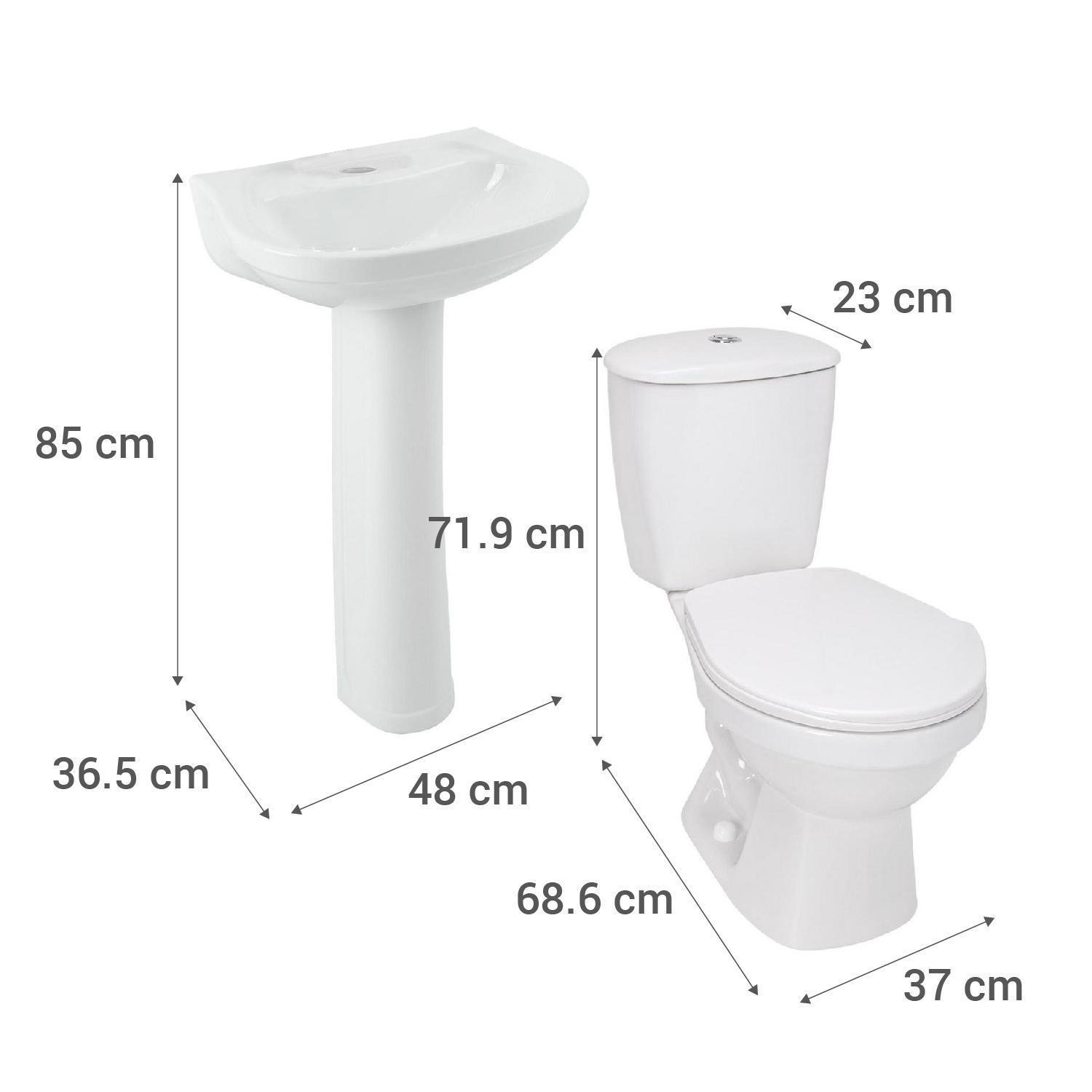 | Características | Incluye taza, estanque, lavamanos y pedestal,No incluye griferia |