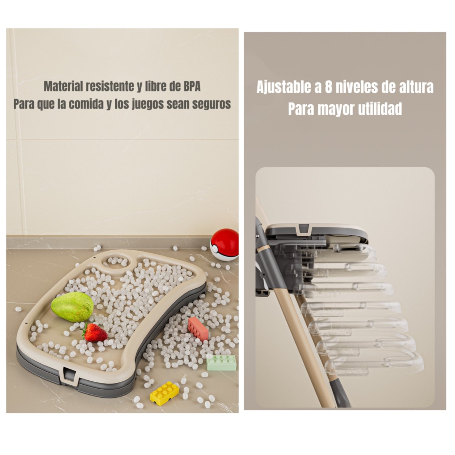 La mesita es multifuncional y desmontable, con modos específicos para la hora de comer y para jugar. Está fabricada con material resistente y libre de BPA, garantizando la seguridad de tu bebé. Además, la mesa es ajustable a 8 niveles de altura para una mayor utilidad.