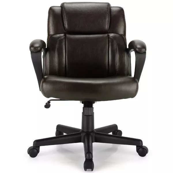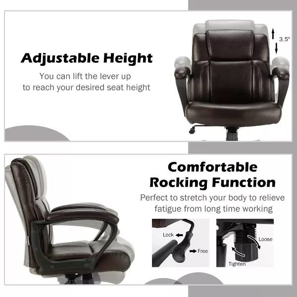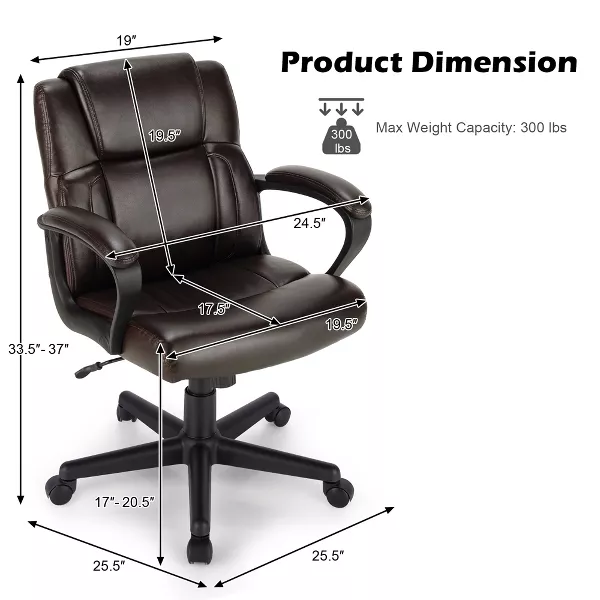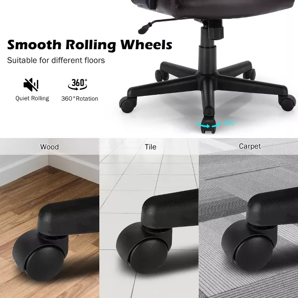 The leather desk chair combines stylish design with comfortable sitting feeling. Supported by a sturdy 5-claw base and a high quality gas rod, this office chair is strong enough to hold up to 300 lbs. With ergonomic design, the mid back chair provides optimal back and lumbar support, extremely alleviating the fatigue after a long day’s work. The smooth PU leather upholstery offers you a soft touch. And the seat height can be easily adjusted to meet your ideal position. What's more, 5 flexible wheels make the chair easy to move around. This swivel executive chair is definitely a perfect addition to your house and office!