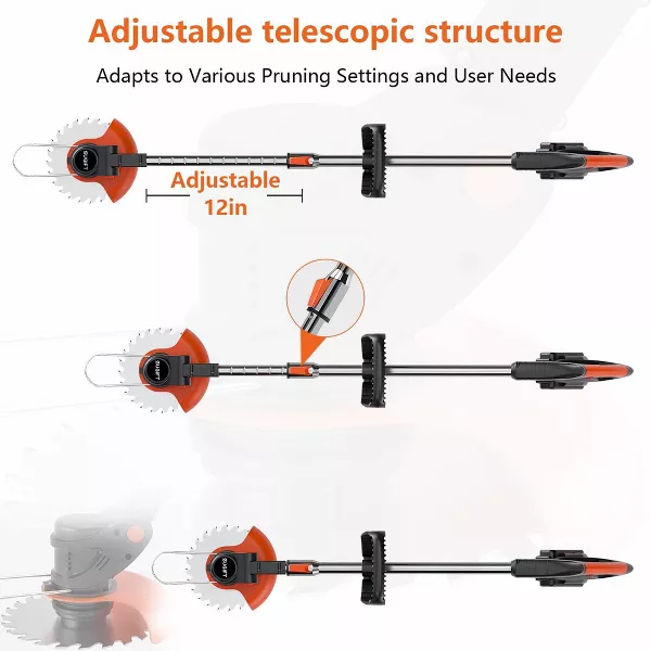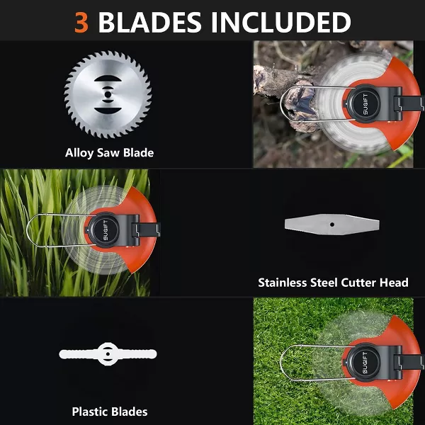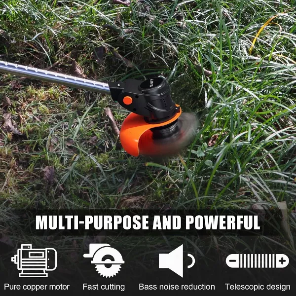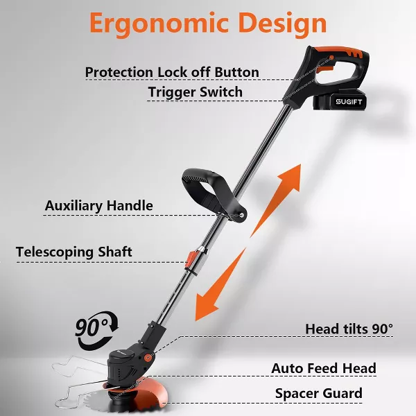 The SUGIFT 21V 6-inch String Trimmer combines cordless convenience with powerful performance. Weighing under 10 lbs, this lightweight trimmer features an auto feed head and requires minimal maintenance—no oil, air filters, or gas needed. With a simple push-button start, it delivers gas-like power while running on a battery that charges in 2 hours, providing up to 30 minutes of runtime for trimming lawns up to half an acre. Its telescoping shaft adjusts to various heights, making it versatile for all your trimming needs.