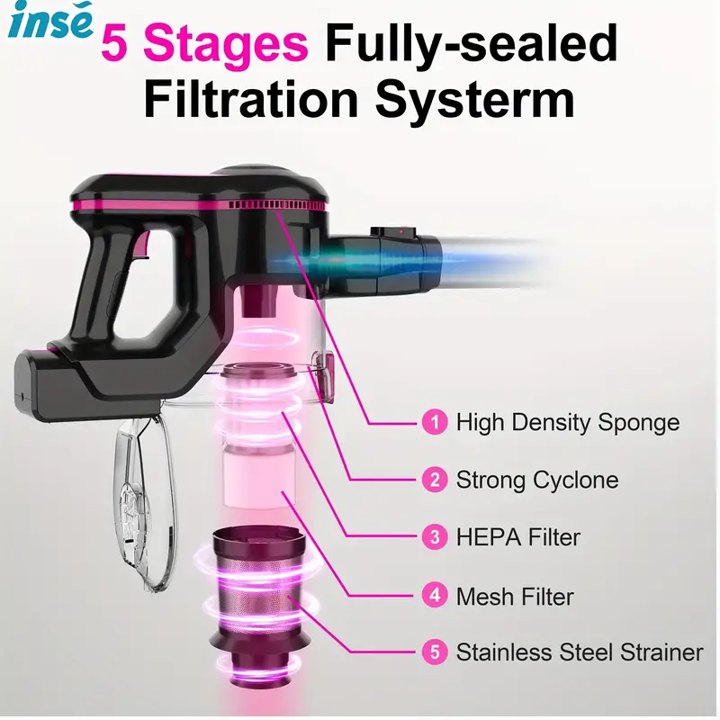 Un sistema de filtración con 5 etapas de alta eficiencia: Viene con un sistema de filtración de ciclón completamente sellado con 5 etapas, que incluye una esponja densa, un filtro de alta eficiencia, un colador de acero inoxidable y una separación de doble ciclón, que atrapa el 99% de las partículas de polvo pequeñas y retiene de forma segura las partículas pequeñas sin fugas, protegiendo así el motor del sobrecalentamiento debido a obstrucciones y liberando aire limpio. Por favor, ten en cuenta: Limpiar regularmente el filtro y la esponja puede prevenir la reducción de la potencia de succión y las obstrucciones.
