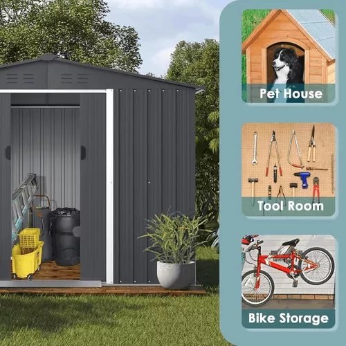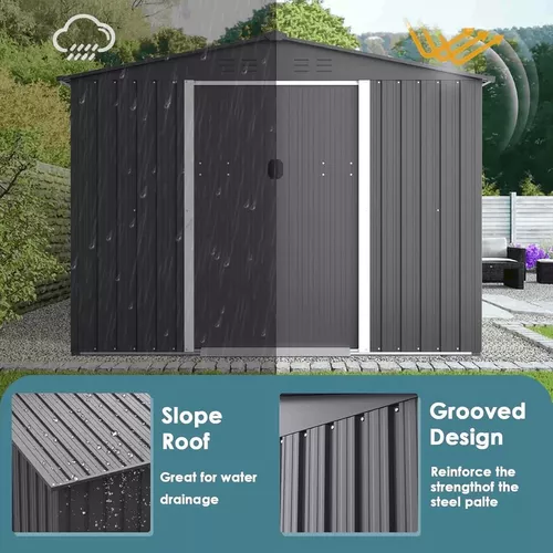 Diseño de pendiente y ventilación: hay un diseño de refuerzo de pendiente en la puerta corrediza salvaje del cobertizo de almacenamiento de jardín. Puede ahorrar mucha fuerza para empujar algunas herramientas pesadas con ruedas, como cortadoras de césped, carros, etc. Estos 2 respiraderos en el lado frontal mantendrán el aire fresco en el cobertizo de herramientas de jardín.