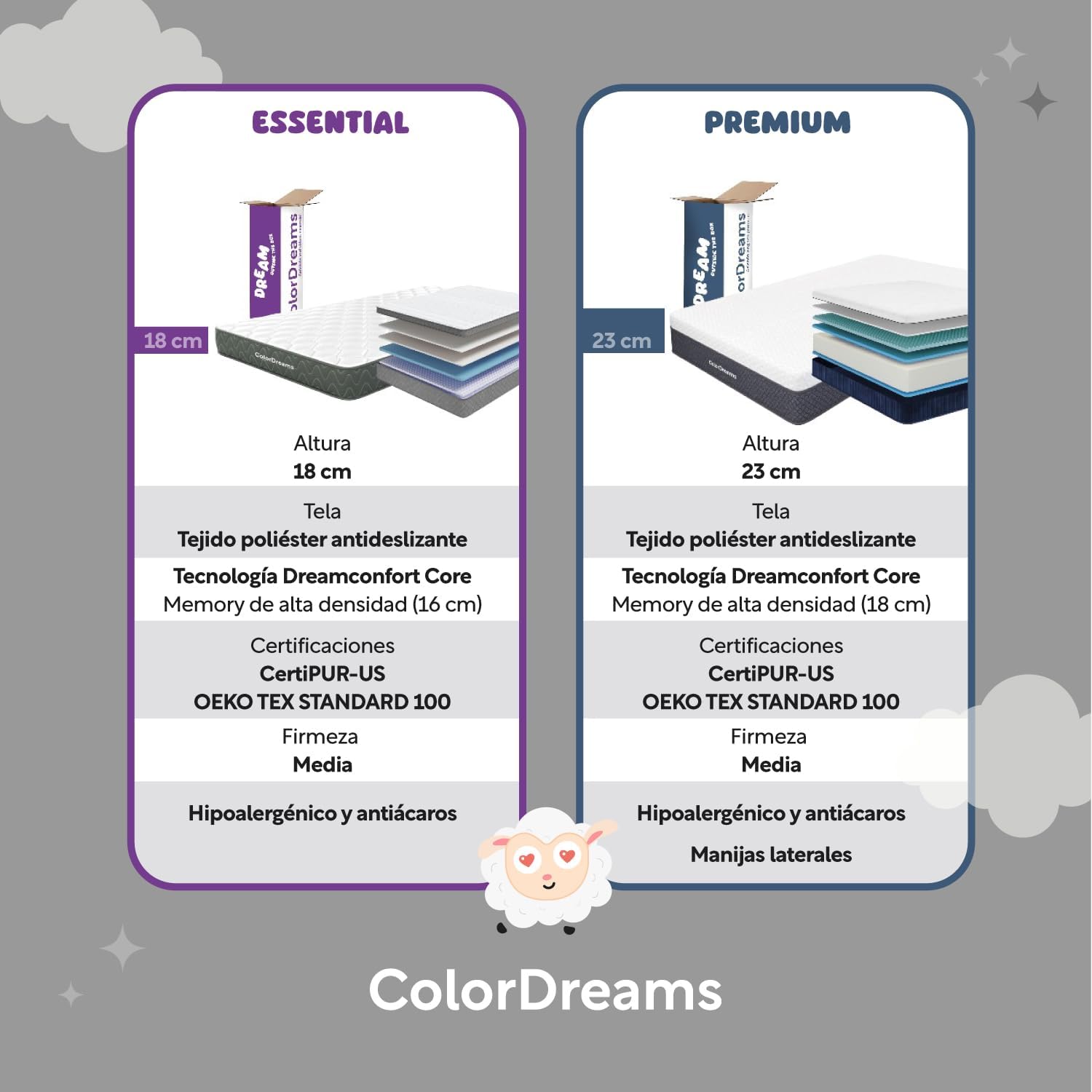 • DREAMTECHNOLOGY EN CADA CAPA: Escudo Non-Slip: Tejido superior antideslizante 100% poliéster. Cloud confort: 2.3 cm de espuma de alta densidad 20kg/m3. Smooth Surface: 25 g. de tela sin costura . DreamConfort Core: 16 cm de espuma de alta densidad 22kg/m3. Escudo Air Flow: 120 kg tela sin costura 100% fibra olefina de alta resistencia.