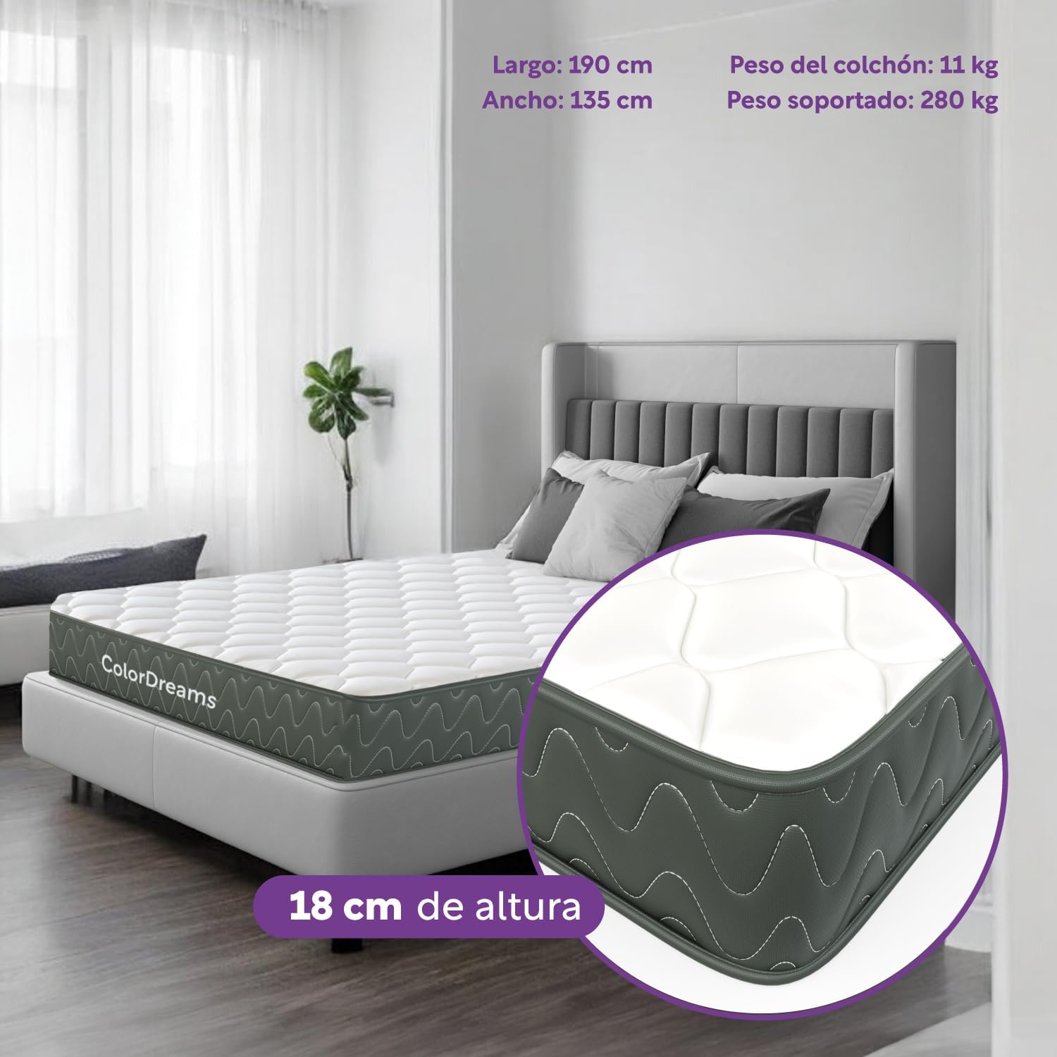 • EL TAMAÑO PERFECTO: Altura: 18 cm x Ancho: 135 cm x Largo: 190 cm; perfecto para niños y adultos. Puede resistir hasta un peso de 280 kg, mientras que el peso del colchón es de 11 kg. Incluye 1 colchón matrimonial de firmeza media. Con certificación Oeko Tex y CertiPUR-US.