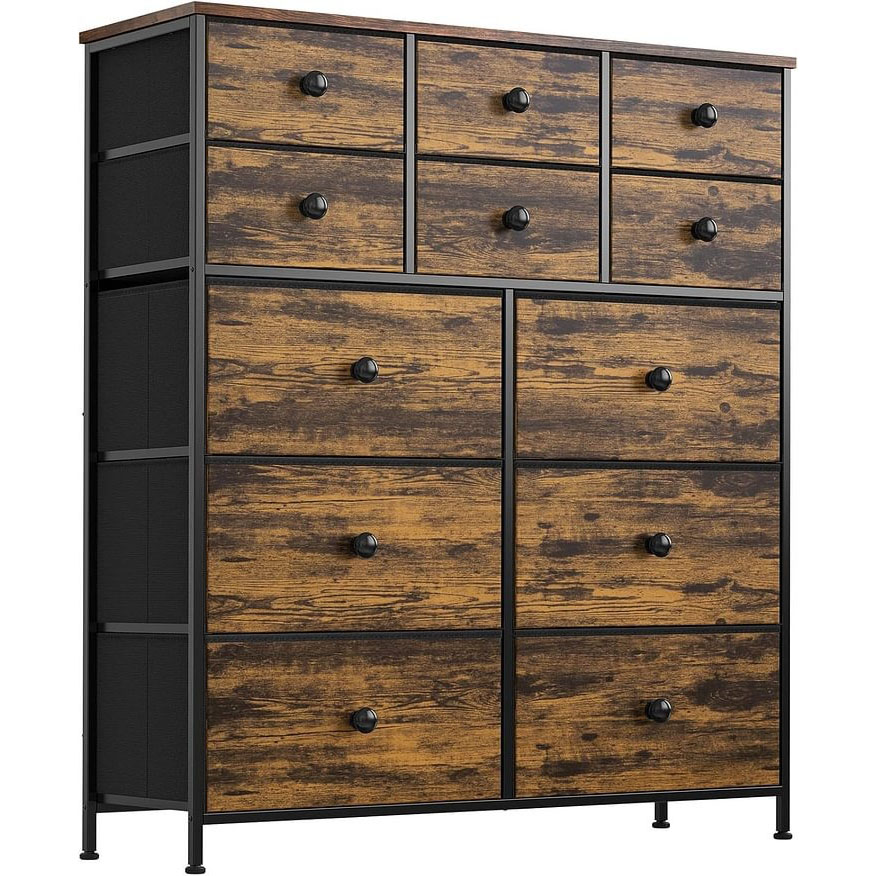 • 【Estructura estable】 El fuerte marco de acero y la parte superior de madera MDF impermeable brindan una resistencia confiable, y el techo sostenido por el marco de acero puede mejorar la estabilidad y la durabilidad. Los cuatro pies ajustables se pueden utilizar en terrenos irregulares y evitar arañazos en el suelo. El cordón en "X" en la parte posterior aumenta la estabilidad del producto. La cómoda de 12 cajones se puede fijar a la pared con un dispositivo antivuelco para evitar posibles riesgos de seguridad para los niños en el hogar.