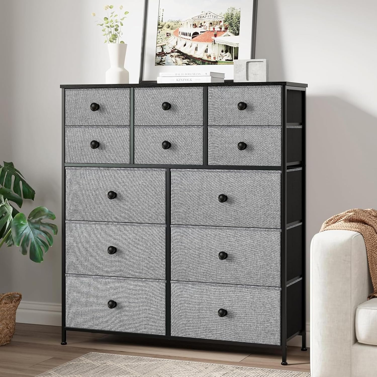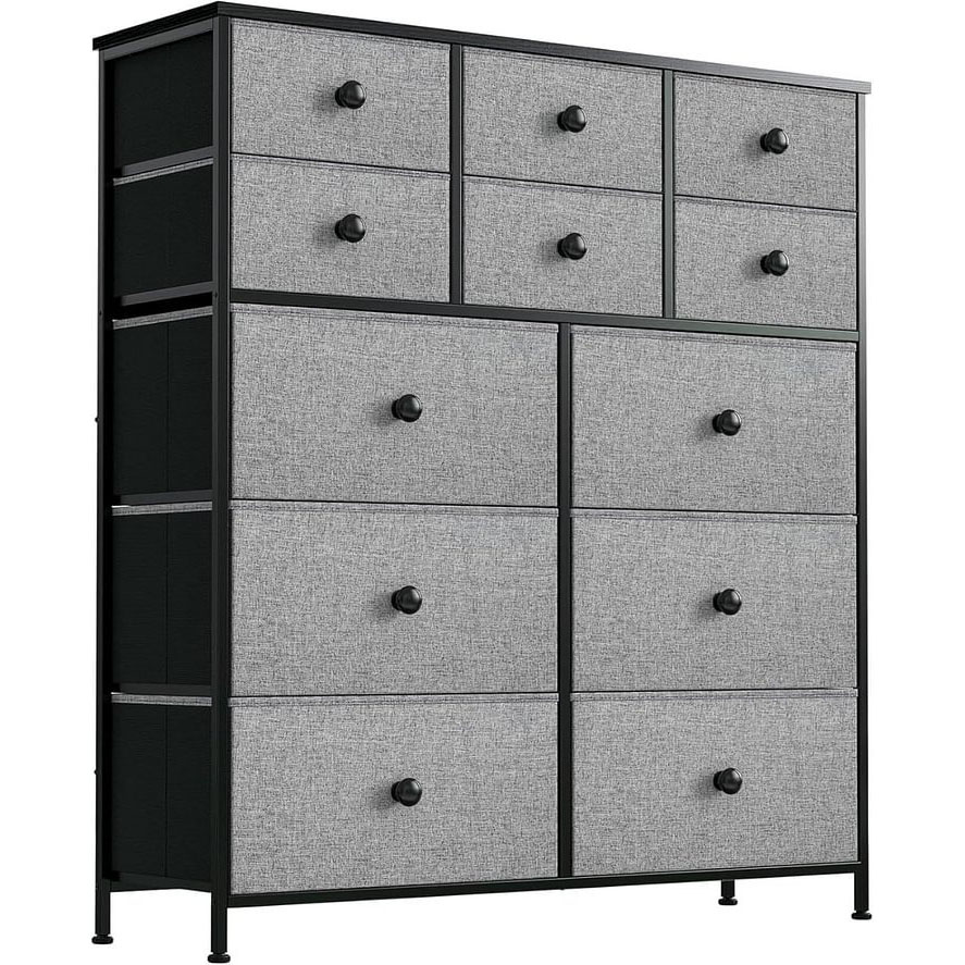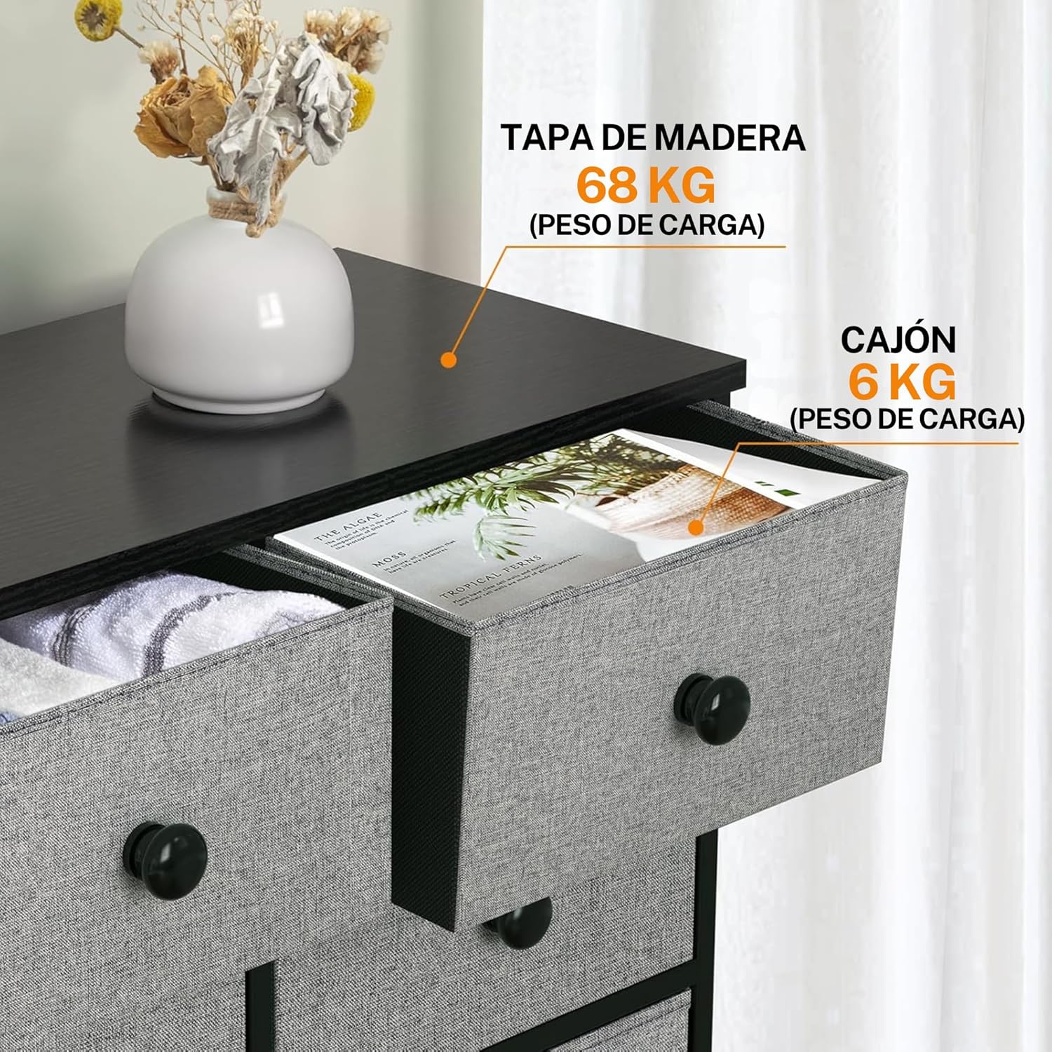 Comoda Cajonera para Recamara- 12 Cajones De Tela con Parte Superior de Madera y Marco De Acero Plegable- Tu Mueble Organizador con cajonera para Ropa (Gris Oxford)