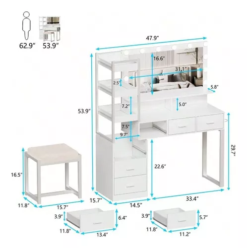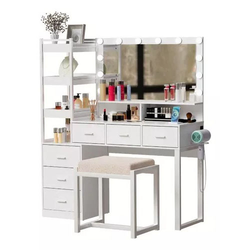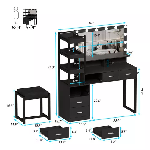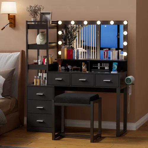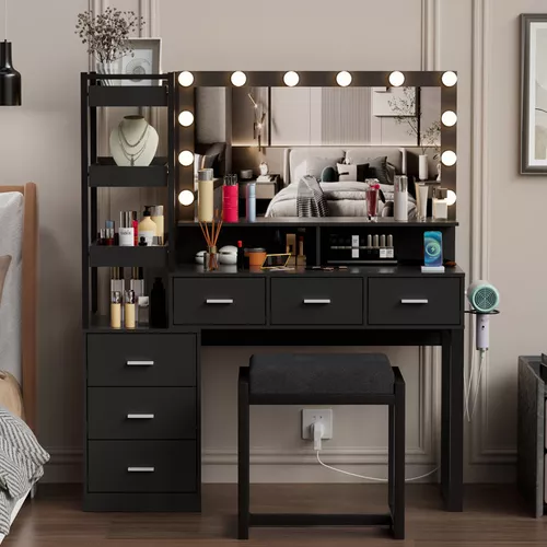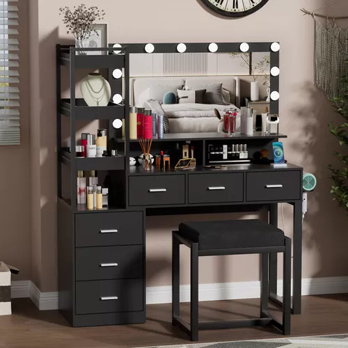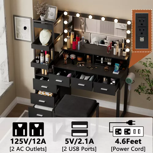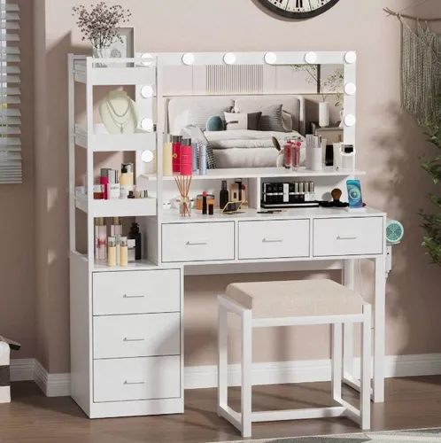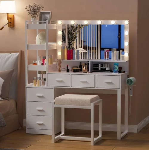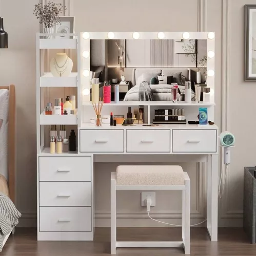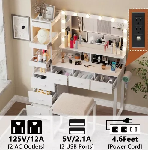 Escritorio de tocador con espejo iluminado por LED, estación de carga integrada