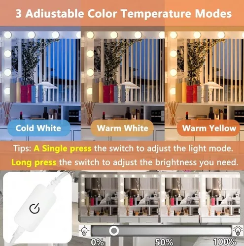 Espejo brillante: un espejo grande ofrece una buena visión y puede verse mejor todos los días. Nuestro tipo cómodo tiene bombillas en el espejo grande y tiene tres modos de color: amarillo cálido, blanco cálido y blanco frío. Puede cambiar fácilmente el color de la luz y ajustar el brillo. Un espejo brillante creará las condiciones ideales para su maquillaje.