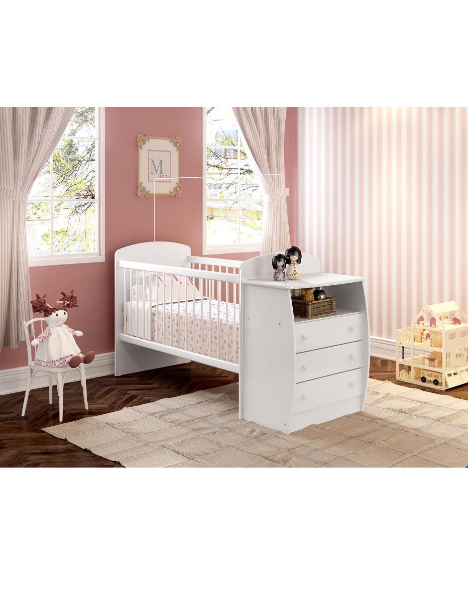 Cuna con cómoda. Tamaño colchón standard americano 1.30 x 0.70 (No Incluido). Base de colchón con 3 niveles de altura ajustable. 3 cajones. 1 nicho. Color blanco