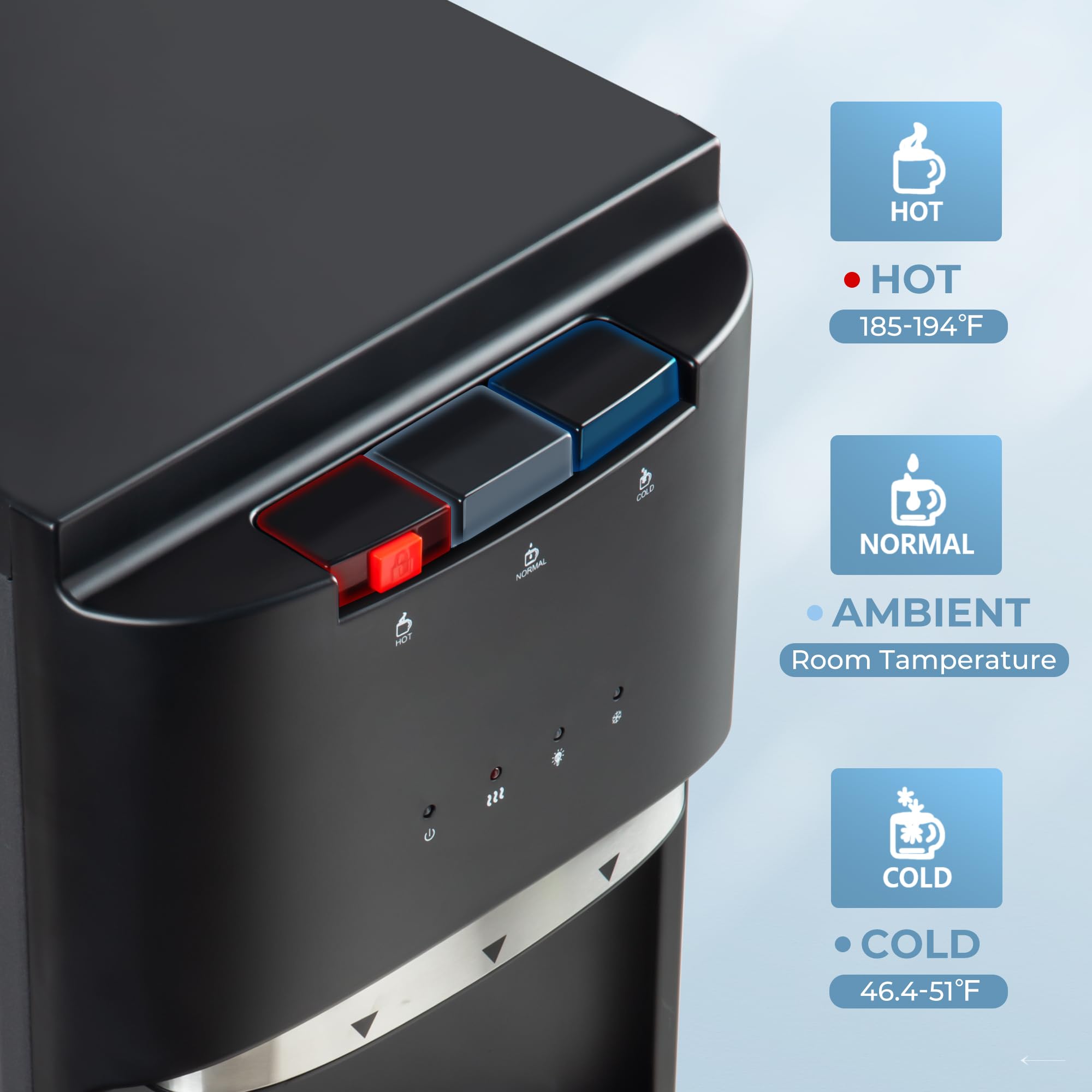 - 【Bottom Loading】No more need to struggle with heavy water bottles. Our bottom loading water dispenser makes your life easier. It not only reduces the strain on your back but also allows you to experience the convenience of investing in an easy-to-use water bottom load dispenser. The design of the bottom loading compartment can streamline your life.