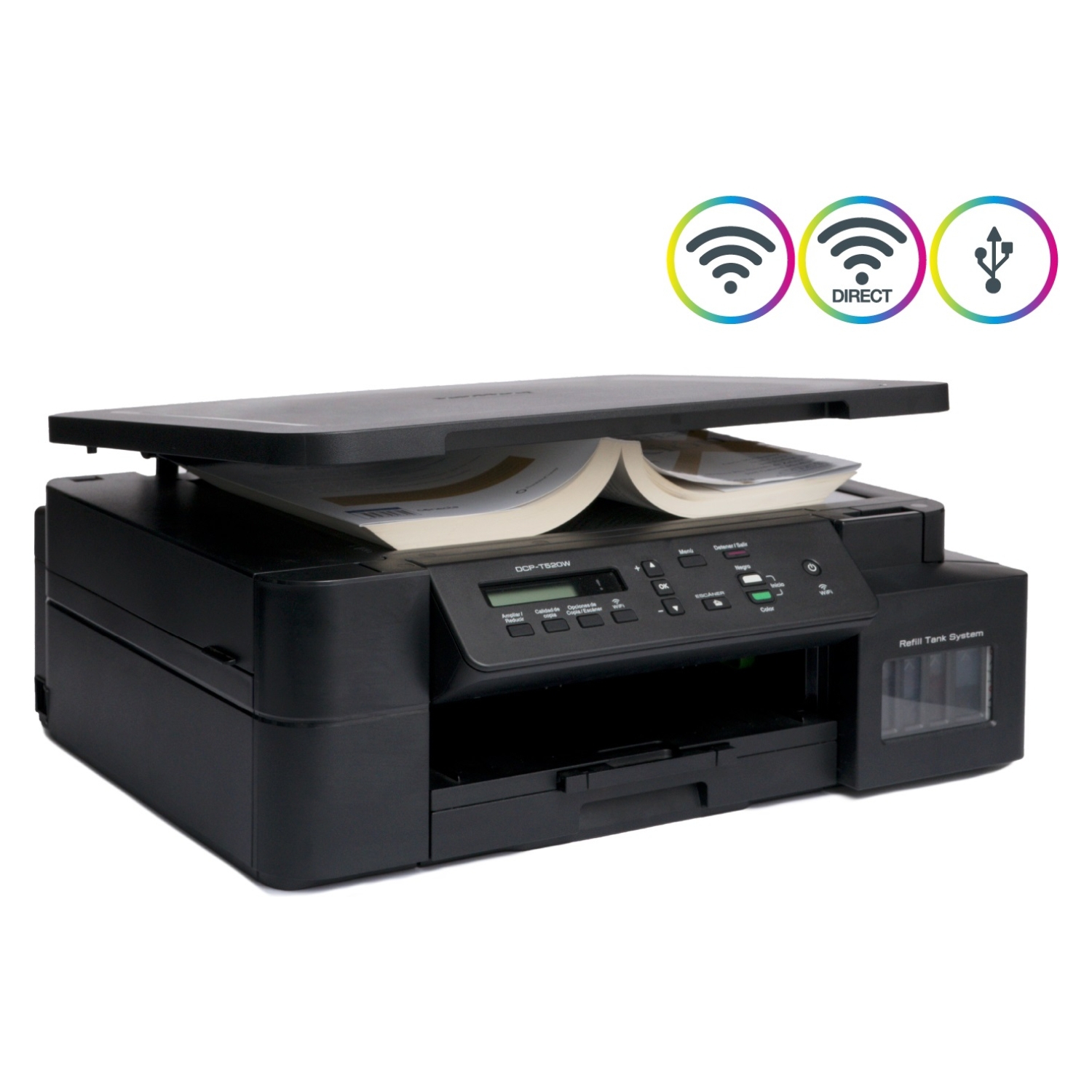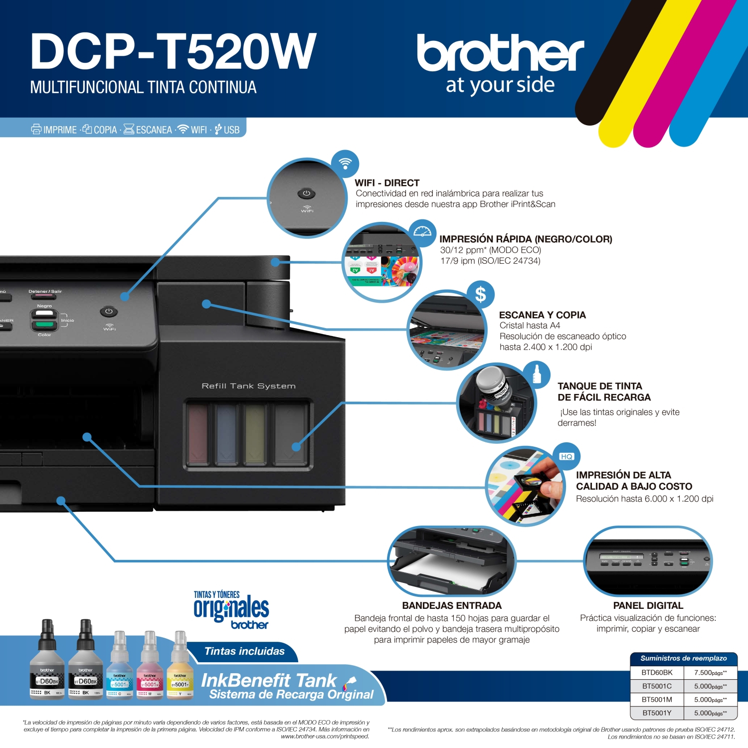Utiliza tintas de recarga BTD60BK (negra con 108 ml) y BT5001C/M/Y (colores con 48,8 ml), para un rendimiento aproximado de 7.500 y 5.000 páginas respectivamente