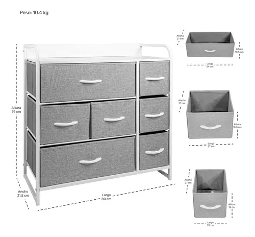• Distribución eficiente con dimensiones generales de 80x31.5x79cm. Los cajones pequeños de 20x27x18cm, los cajones medianos de 27x27x18.5cm y los cajones grandes de 54x27x18.5cm ofrecen una distribución eficiente para organizar artículos de distintos tamaños.