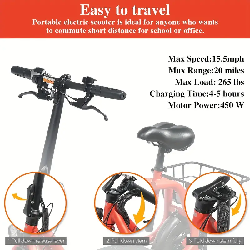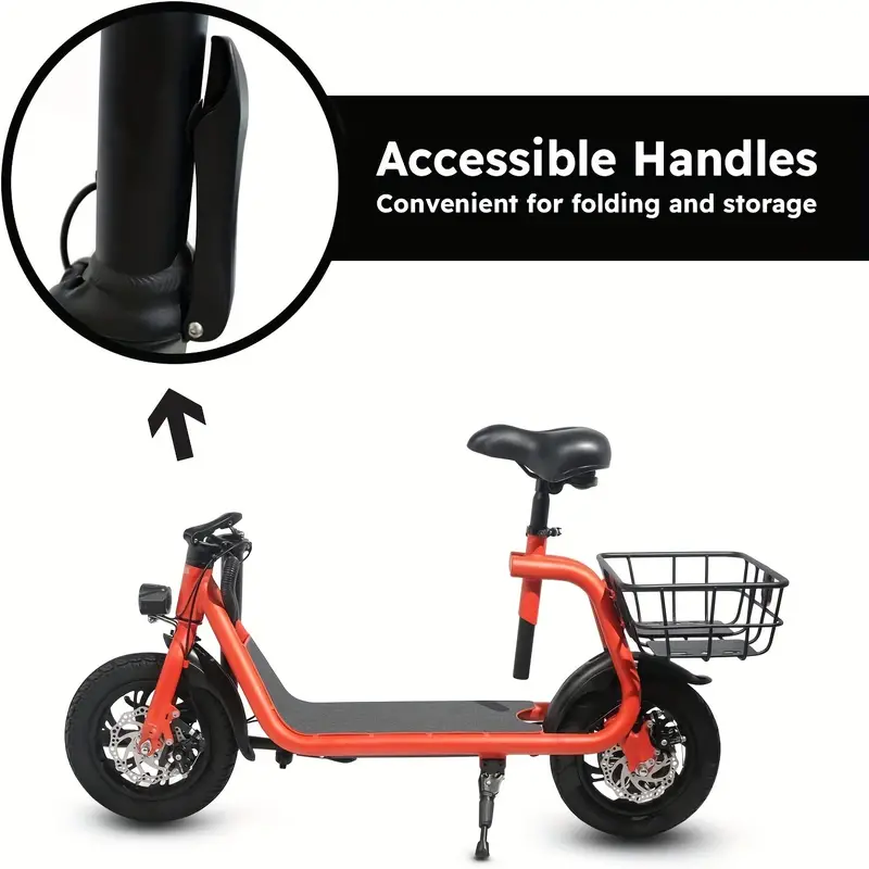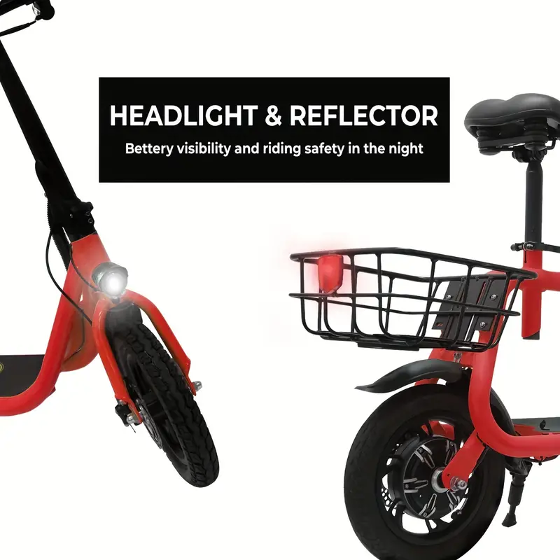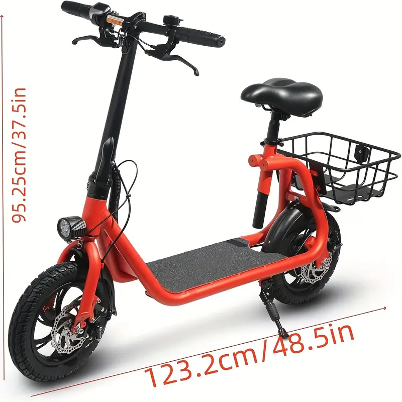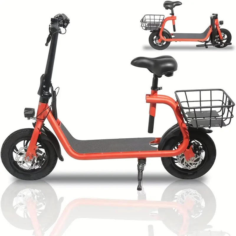 Diseño plegable que reduce el espacio de almacenamiento y se puede colocar fácilmente en el maletero. Batería recargable de 36V 8Ah, puede recorrer hasta 20 millas con una sola carga. Motor recién actualizado de 450W que proporciona una velocidad máxima de 15.5 mph y una altura máxima de escalada de 7.2°. Ruedas dobles de 12 pulgadas/30.48 cm, pueden circular en una variedad de carreteras. Asiento ajustable, adecuado para personas de diferentes alturas. Con cesta de almacenamiento trasera.