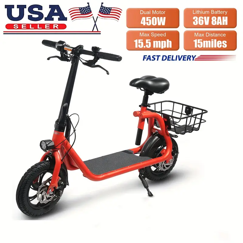 Scooter eléctrico de 450W con asiento ajustable, poste plegable, scooter eléctrico deportivo de 36V 8Ah, velocidad máxima 15.5Mph, rojo
