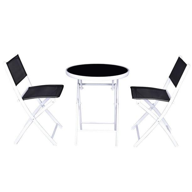 El set completo incluye 1 mesa plegable y 2 sillas plegables|| Superficie en vidrio templado resistente al calor y a los rasguños|| Estructura en acero con revestimiento en polvo para garantir resistencia y duración|| La mesa aguanta hasta 60 kg y las sillas 120 kg cada una|| Mesa y sillas plegables fáciles de almacenar y transportar|| Almohadillas antideslizantes en la parte inferior para evitar rayar el suelo|| Ningún montaje requerido, fácil de limpiar|| Perfecto para uso interno y externo como patio, piscina y salón||