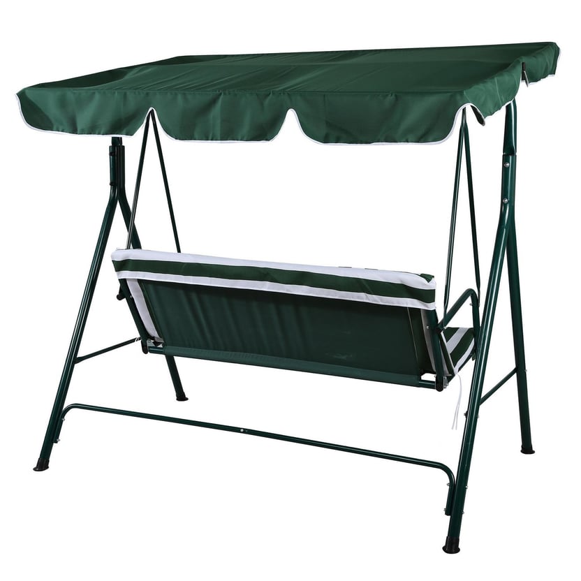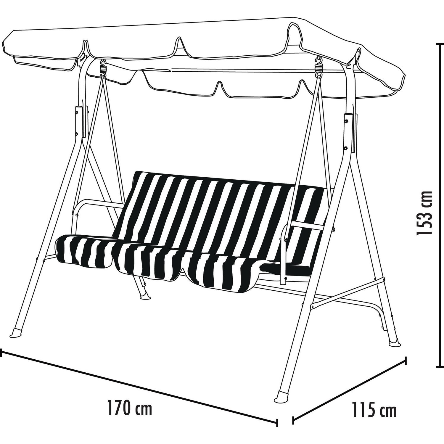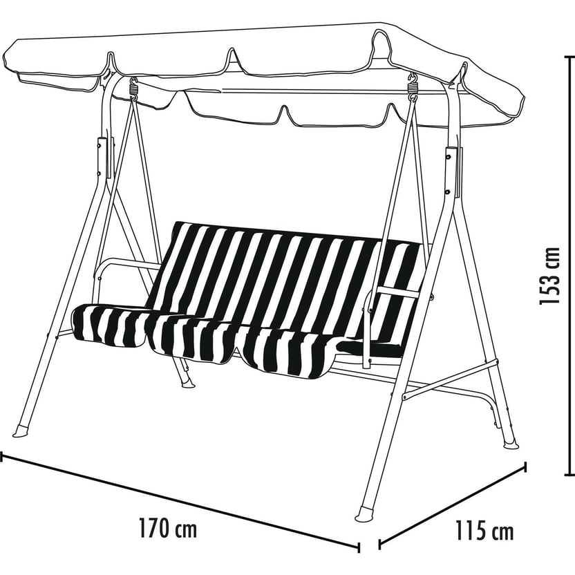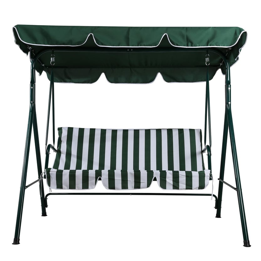 El Sillón Columpio 3 personas Rayas Verde está hecho de acero y tiene un peso máximo soportado de 220 kg. Su asiento es de 100% poliéster y requiere armado. El columpio es de tipo sillón colgante y tiene un ancho de 170 cm, un alto de 153 cm y una profundidad de 115 cm. Además, tiene capacidad para 3 personas.