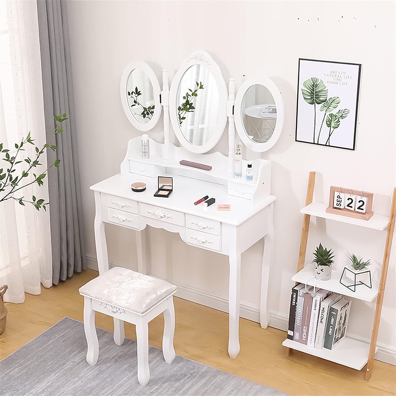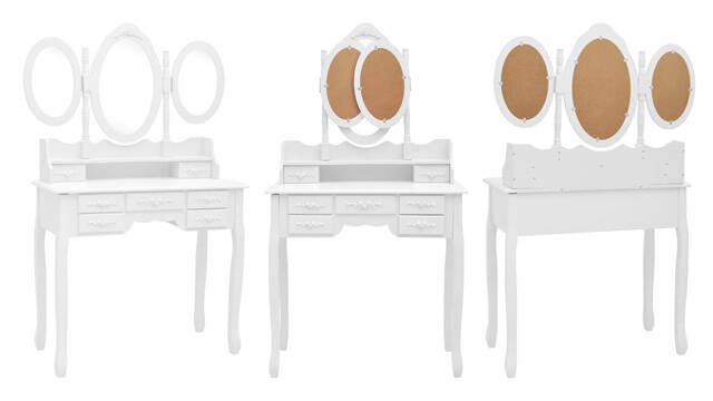 - Este elegante tocador cuenta con 3 espejos ovalados, 7 cajones, patas sencillas de estilo reina Ana y un cómodo taburete.