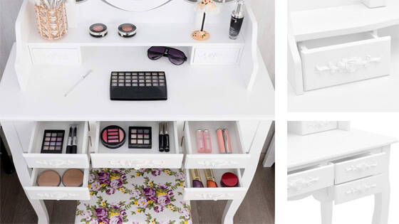 Equipado con 7 cajones y un estante, ofrece suficiente espacio de almacenamiento para organizar y clasificar tus cosméticos. Los pomos de los cajones están diseñados como exquisitas flores, facilitando su apertura y cierre. La superficie amplia y lisa te permite colocar cómodamente tus accesorios diarios.