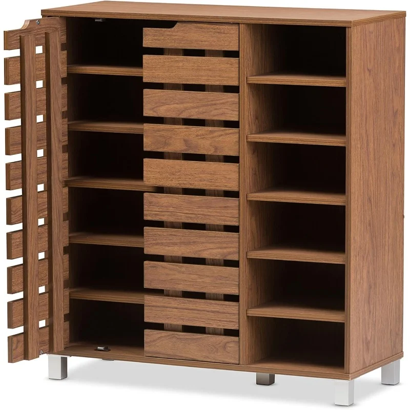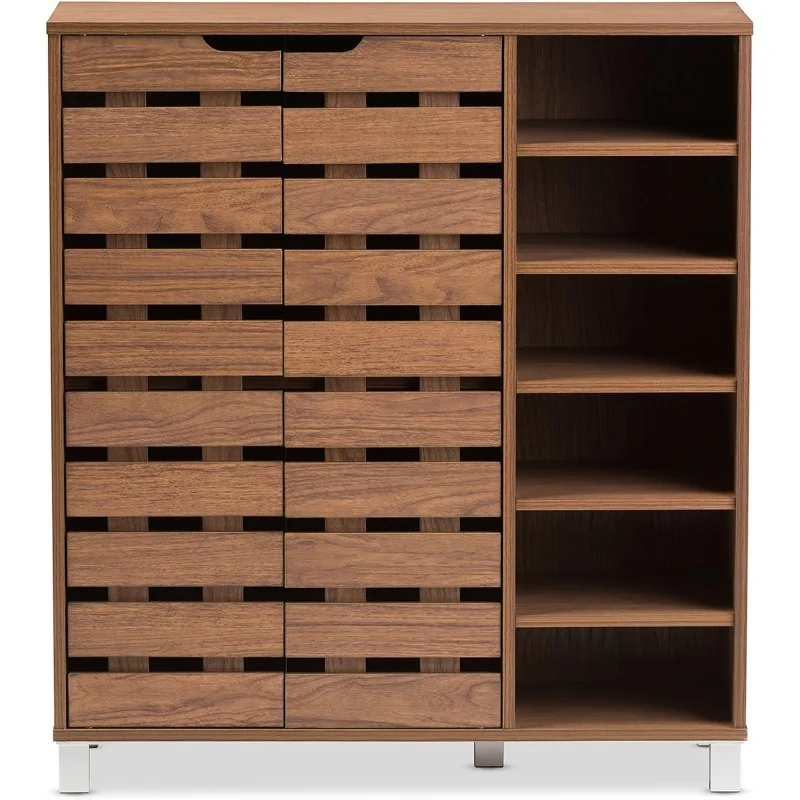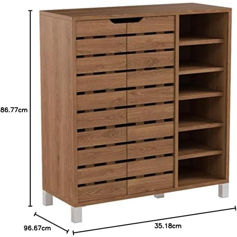 Las 2 puertas revelan una capacidad de almacenamiento de 18 pares, mientras que los estantes abiertos pueden albergar 6 pares de zapatos adicionales